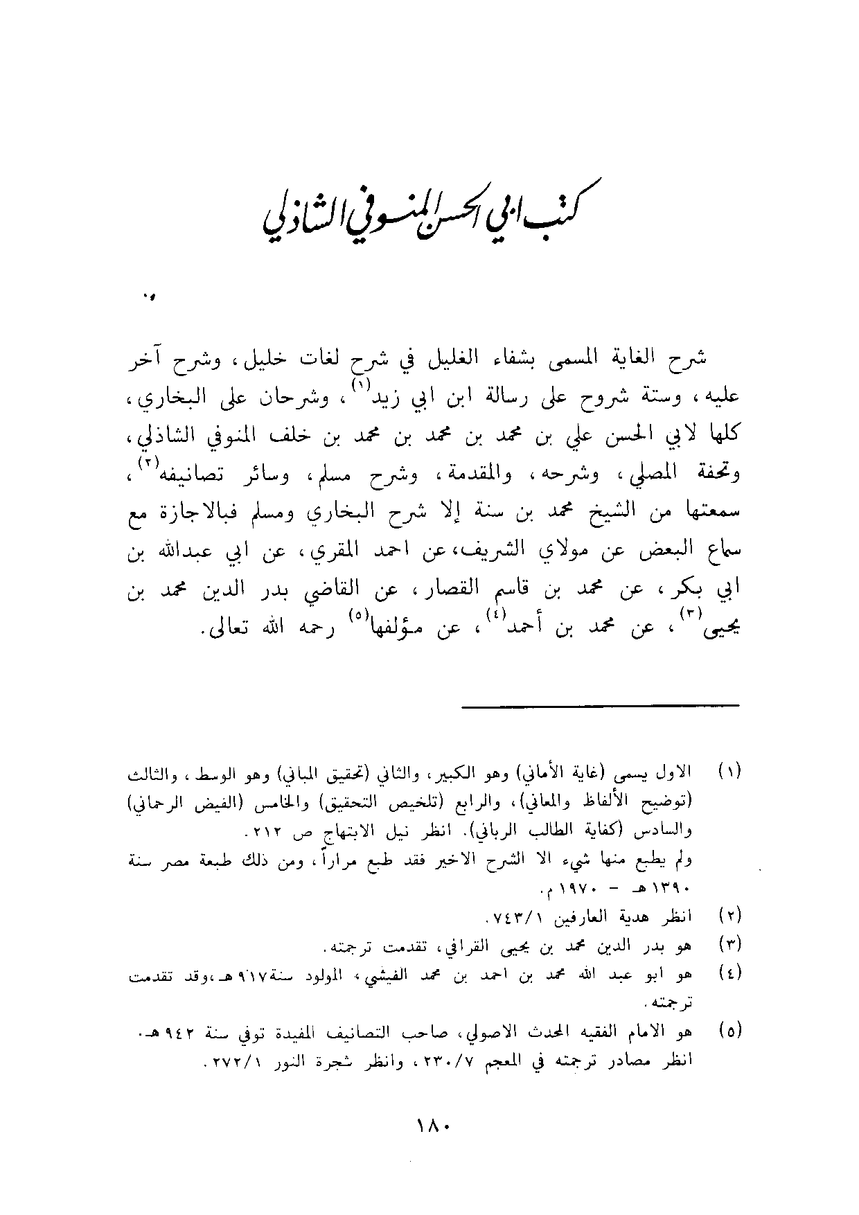 شرح الْغَايَة الْمُسَمّى بشفاء الغليل فِي شرح لُغَات خَلِيل وَشرح آخر عَلَيْهِ وَسِتَّة شُرُوح على رِسَالَة ابْن ابي زيد وشرحان على البُخَارِيّ كلهَا لابي الْحسن عَليّ بن مُحَمَّد بن مُحَمَّد بن مُحَمَّد بن خلف المنوفي الشاذلي وتحفة الْمُصَلِّي وَشَرحه والمقدمة وَشرح مُسلم وَسَائِر تصانيفه سَمعتهَا من الشَّيْخ مُحَمَّد بن سنة إِلَّا شرح البُخَارِيّ وَمُسلم فبالاجازة مَعَ سَماع الْبَعْض عَن مولَايَ الشريف عَن احْمَد الْمقري عَن ابي عبد الله بن ابي بكر عَن مُحَمَّد بن قَاسم الْقصار عَن القَاضِي بدر الدّين مُحَمَّد بن يحيى عَن مُحَمَّد بن أَحْمد عَن مؤلفها رَحمَه الله تَعَالَى