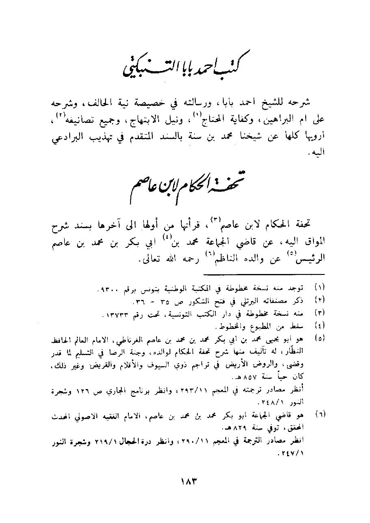 تحفة الْحُكَّام لِابْنِ عَاصِم قرأتها من أَولهَا الى آخرهَا بِسَنَد شرح الْمواق اليه عَن قَاضِي الْجَمَاعَة مُحَمَّد بن ابي بكر بن مُحَمَّد بن عَاصِم الرئيس عَن وَالِده النَّاظِم رَحمَه الله تَعَالَى