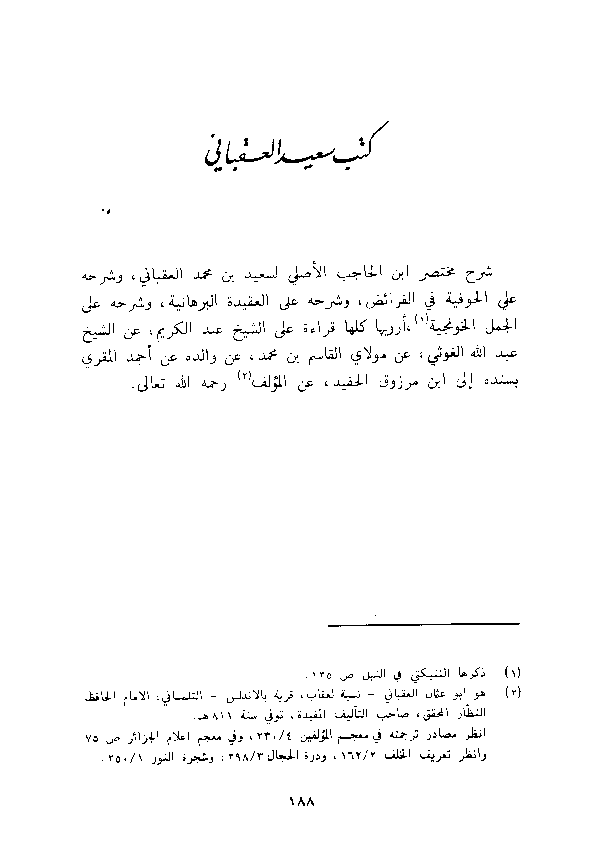 شرح مُخْتَصر ابْن الْحَاجِب الْأَصْلِيّ لسَعِيد بن مُحَمَّد العقباني وَشَرحه عَليّ الحوفية فِي الْفَرَائِض وَشَرحه على العقيده البرهانية وَشَرحه على الْجمل الخونجية أرويها كلهَا قِرَاءَة على الشَّيْخ عبد الْكَرِيم عَن الشَّيْخ عبد الله الغوثي عَن مولَايَ الْقَاسِم بن مُحَمَّد عَن وَالِده عَن أَحْمد الْمقري بِسَنَدِهِ الى ابْن مَرْزُوق الْحَفِيد عَن الْمُؤلف رَحمَه الله تَعَالَى