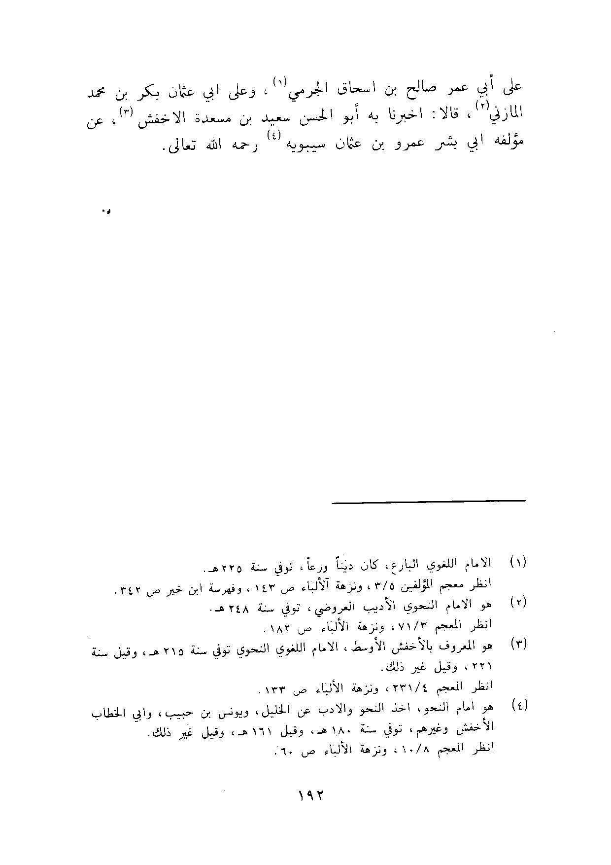 على أبي عمر صَالح بن اسحاق الْجرْمِي وعَلى ابي عُثْمَان بكر بن مُحَمَّد الْمَازِني قَالَا اُخْبُرْنَا بِهِ أَبُو الْحسن سعيد بن مسْعدَة الاخفش عَن مُؤَلفه ابي بشر عَمْرو بن عُثْمَان سِيبَوَيْهٍ رَحمَه الله تَعَالَى