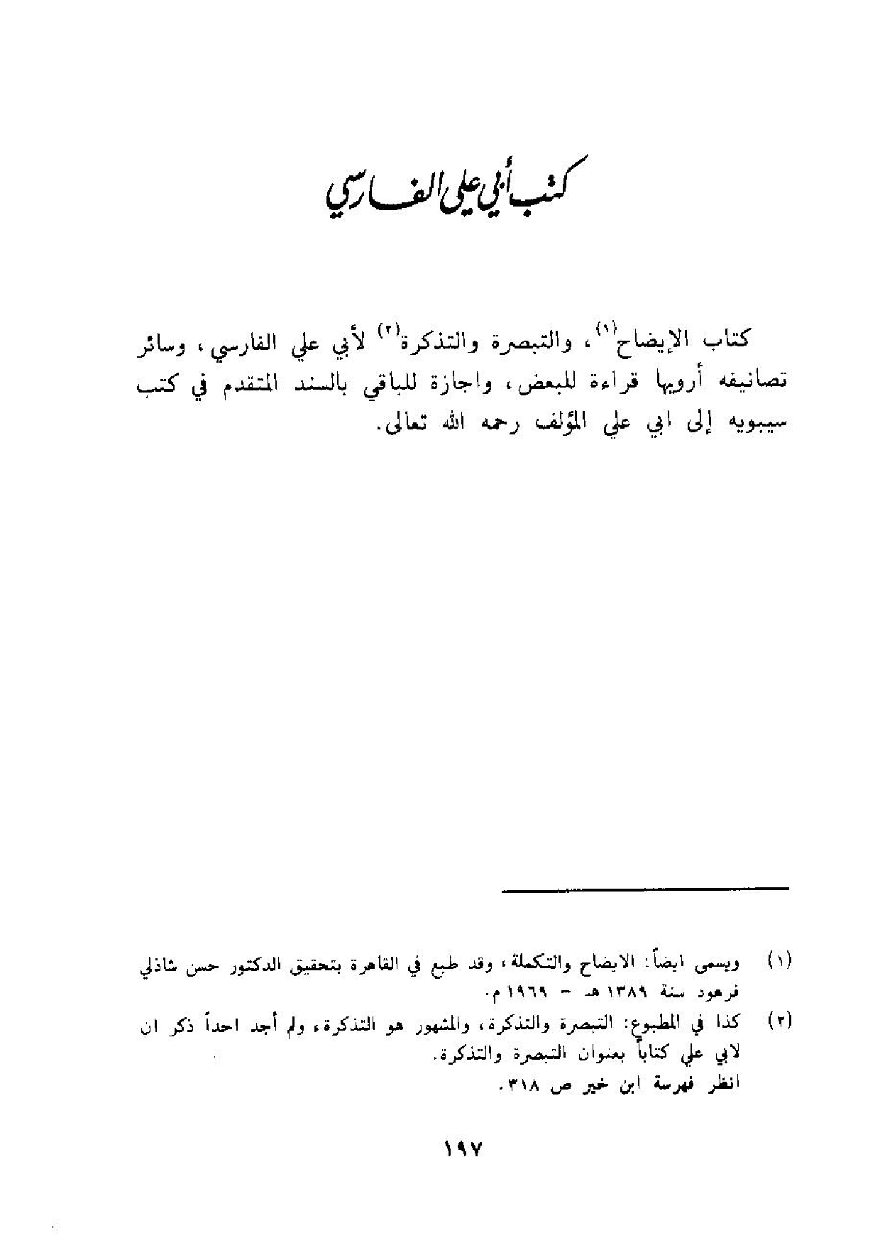 كتاب الايضاح والتبصرة والتذكرة لأبي عَليّ القارسي وَسَائِر تصانيفه أرويها قِرَاءَة للْبَعْض واجازة للْبَاقِي بالسند الْمُتَقَدّم فِي كتب سِيبَوَيْهٍ الى ابي عَليّ الْمُؤلف رَحمَه الله تَعَالَى