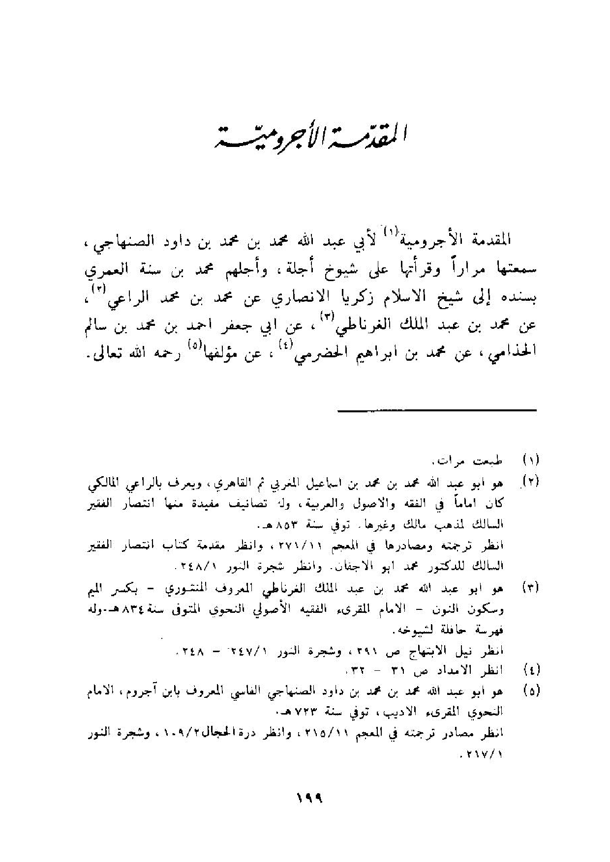 الْمُقدمَة الاجرومية لأبي عبد الله مُحَمَّد بن مُحَمَّد بن دَاوُد الصنهاجي سَمعتهَا مرَارًا وقرأتها على شُيُوخ أجلة وأجلهم مُحَمَّد بن سنة الْعمريّ بِسَنَدِهِ الى شيخ الاسلام زَكَرِيَّا الانصاري عَن مُحَمَّد بن مُحَمَّد الرَّاعِي عَن مُحَمَّد بن عبد الْملك الغرناطي عَن ابي جَعْفَر احْمَد بن مُحَمَّد بن سَالم الحذامي عَن مُحَمَّد بن ابراهيم الْحَضْرَمِيّ عَن مؤلفها رَحمَه الله تَعَالَى