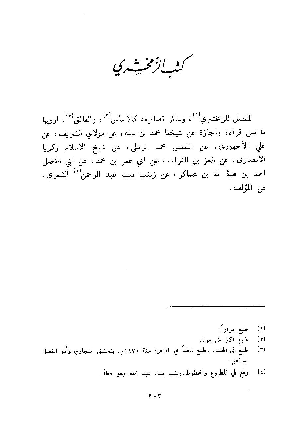الْمفصل للزمخشري وَسَائِر تصانيفه كالاساس وَالْفَائِق ارويها مَا بَين قِرَاءَة واجازة عَن شَيخنَا مُحَمَّد بن سنة عَن مولَايَ الشريف عَن عَليّ الأَجْهُورِيّ عَن الشَّمْس مُحَمَّد الرَّمْلِيّ عَن شيخ الاسلام زَكَرِيَّا الْأنْصَارِيّ عَن الْعِزّ بن الْفُرَات عَن ابي عمر بن مُحَمَّد عَن ابي الْفضل احْمَد بن هبة الله بن عَسَاكِر عَن زَيْنَب بنت عبد الرَّحْمَن الشعري عَن الْمُؤلف