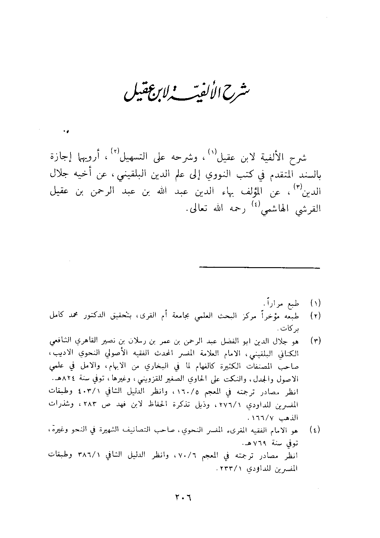 شرح الألفية لِابْنِ عقيل وَشَرحه على التسهيل أرويهما إجَازَة بالسند الْمُتَقَدّم فِي كتب النَّوَوِيّ الى علم الدّين البُلْقِينِيّ عَن أَخِيه جلال الدّين عَن الْمُؤلف بهاء الدّين عبد الله بن عبد الرَّحْمَن بن عقيل الْقرشِي الْهَاشِمِي رَحمَه الله تَعَالَى