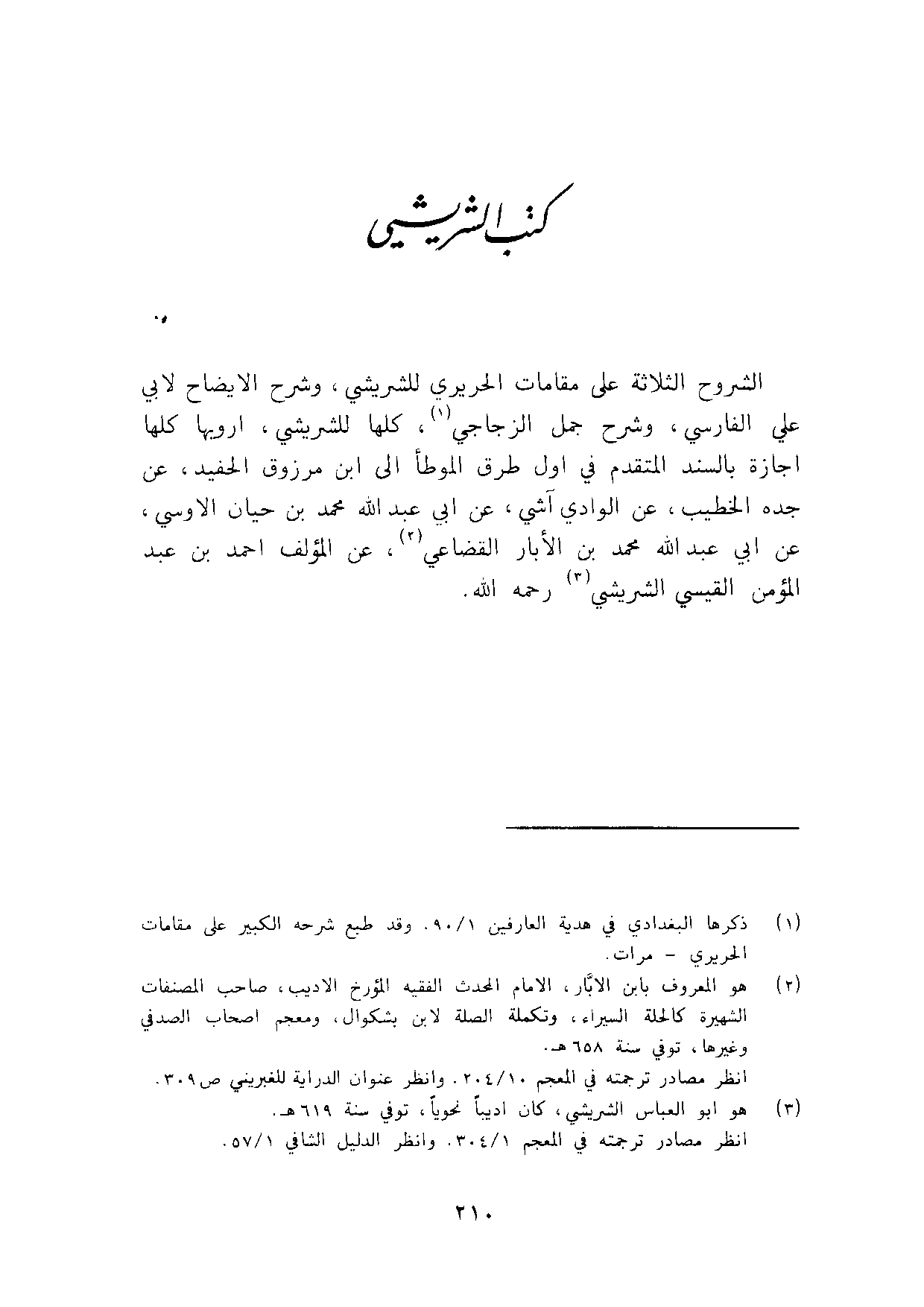 الشُّرُوح الثَّلَاثَة على مقامات الحريري للشريشي وَشرح الايضاح لابي عَليّ الْفَارِسِي وَشرح جمل الزجاجي كلهَا للشريشي ارويها كلهَا اجازة بالسند الْمُتَقَدّم فِي اول طرق الْمُوَطَّأ الى ابْن مَرْزُوق الْحَفِيد عَن جده الْخَطِيب عَن الْوَادي آشي عَن ابي عبد الله مُحَمَّد بن حَيَّان الاوسي عَن ابي عبد الله مُحَمَّد بن الْأَبَّار الْقُضَاعِي عَن الْمُؤلف احْمَد بن عبد الْمُؤمن الْقَيْسِي الشريشي رَحمَه الله