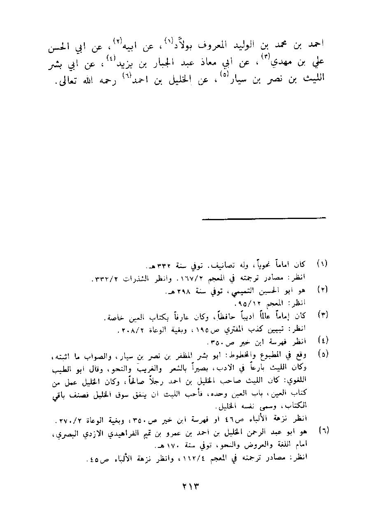 احْمَد بن مُحَمَّد بن الْوَلِيد الْمَعْرُوف بولاد عَن ابيه عَن ابي الْحسن عَليّ بن مهْدي عَن ابي معَاذ عبد الْجَبَّار بن يزِيد عَن ابي بشر اللَّيْث بن نصر بن سيار عَن الْخَلِيل بن احْمَد رَحمَه الله تَعَالَى