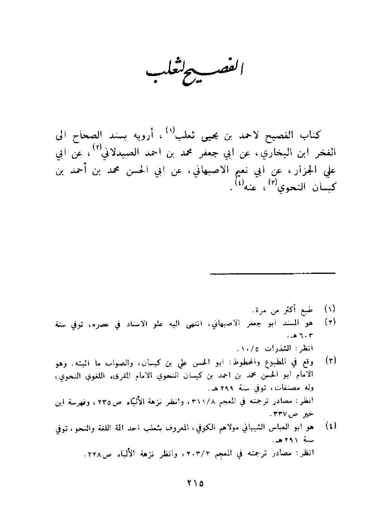 كتاب الفصيح لاحمد بن يحيى ثَعْلَب أرويه بِسَنَد الصِّحَاح الى الْفَخر ابْن البُخَارِيّ عَن ابي جَعْفَر مُحَمَّد بن احْمَد الصيدلاني عَن ابي عَليّ الجزار عَن ابي نعيم الاصبهاني عَن ابي الْحسن مُحَمَّد بن أَحْمد بن كيسَان النَّحْوِيّ عَنهُ