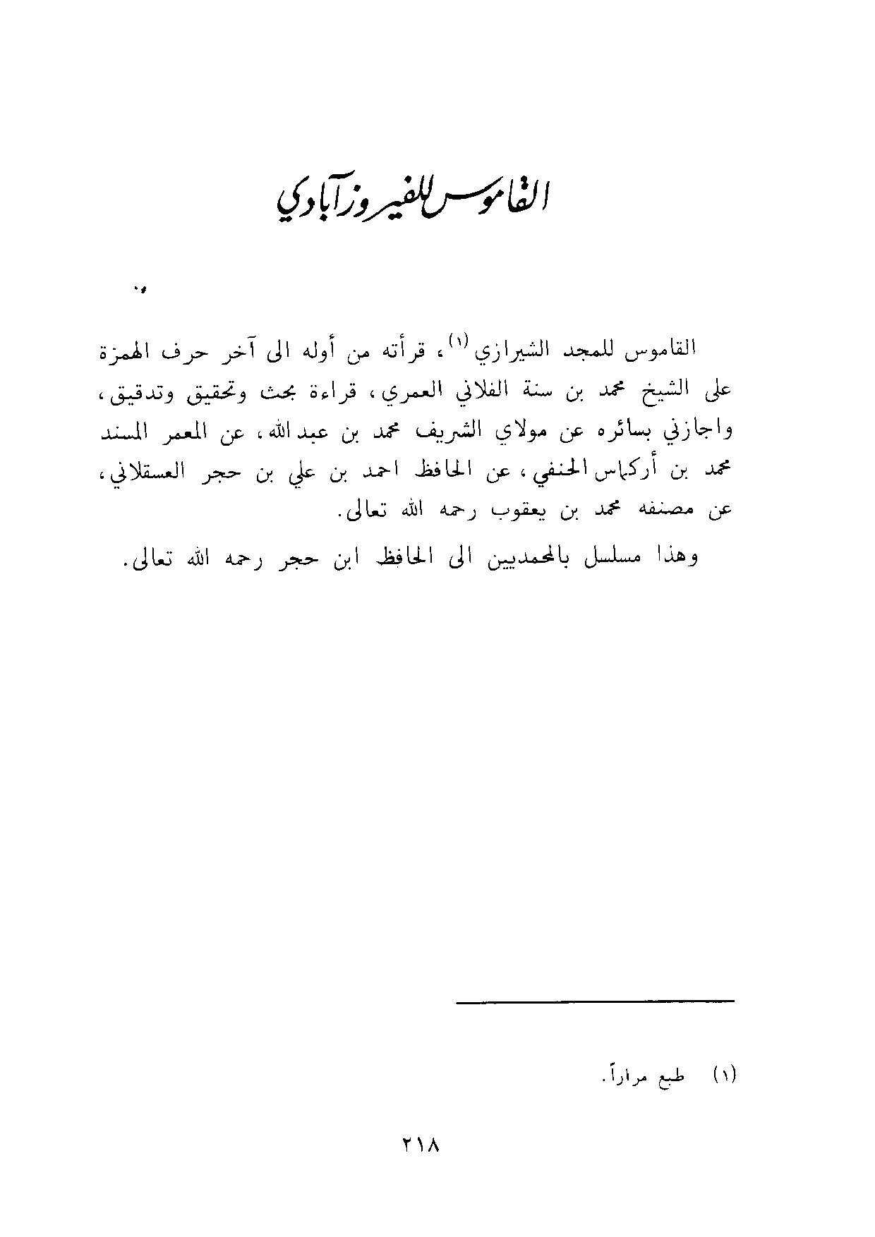 الْقَامُوس للمجد الشِّيرَازِيّ قرأته من أَوله الى آخر حرف الْهمزَة على الشَّيْخ مُحَمَّد بن سنة الْفُلَانِيّ الْعمريّ قِرَاءَة بحث وَتَحْقِيق وتدقيق واجازني بسائره عَن مولَايَ الشريف مُحَمَّد بن عبد الله عَن المعمر الْمسند مُحَمَّد بن أركماس الْحَنَفِيّ عَن الْحَافِظ احْمَد بن عَليّ بن حجر الْعَسْقَلَانِي عَن مُصَنفه مُحَمَّد بن يَعْقُوب رَحمَه الله تَعَالَى