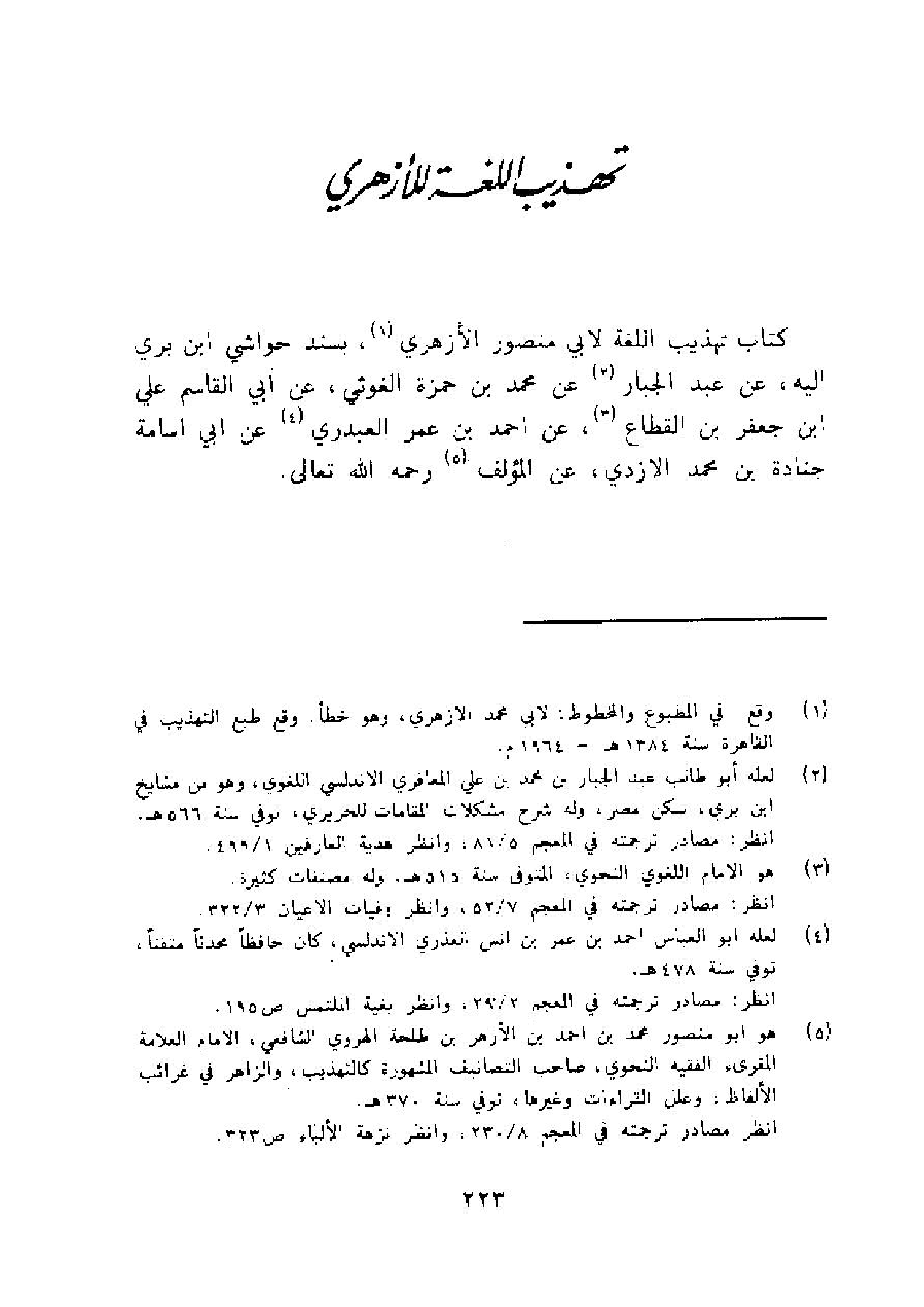 كتاب تَهْذِيب اللُّغَة لابي مَنْصُور الْأَزْهَرِي بِسَنَد حَوَاشِي ابْن بري اليه عَن عبد الْجَبَّار عَن مُحَمَّد بن حَمْزَة الغوثي عَن ابي الْقَاسِم عَليّ ابْن جَعْفَر بن القطاع عَن احْمَد بن عمر الْعَبدَرِي عَن ابي اسامة جُنَادَة بن مُحَمَّد الازدي عَن الْمُؤلف رَحمَه الله تَعَالَى