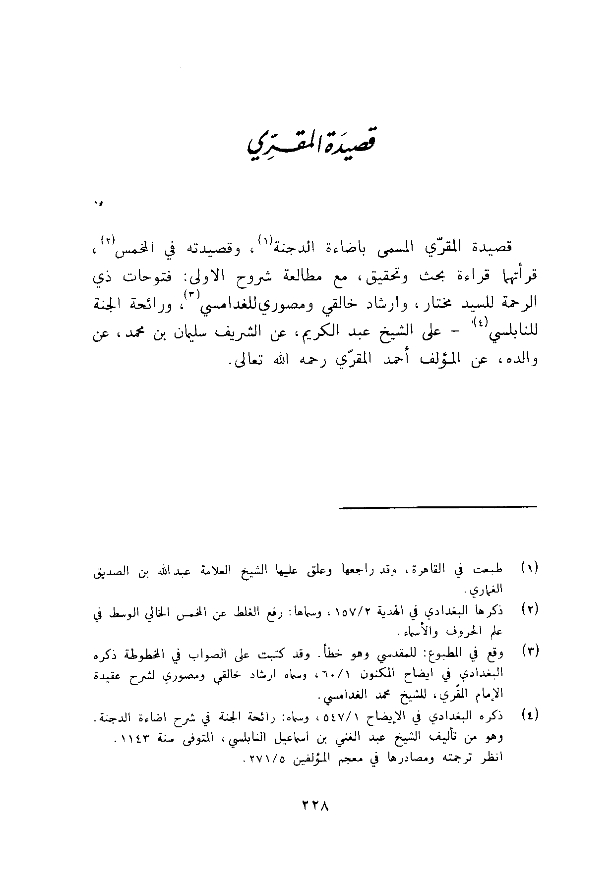 قصيدة الْمقري الْمُسَمّى باضاءة الدجنة وقصيدته فِي المخمس قرأتهما قِرَاءَة بحث وَتَحْقِيق مَعَ مطالعة شُرُوح الاولى فتوحات ذِي الرَّحْمَة للسَّيِّد مُخْتَار وارشاد خالقي ومصوري للغدامسي ورائحة الْجنَّة للنابلسي على الشَّيْخ عبد الْكَرِيم عَن الشريف سُلَيْمَان بن مُحَمَّد عَن وَالِده عَن الْمُؤلف أَحْمد الْمقري رَحمَه الله تَعَالَى