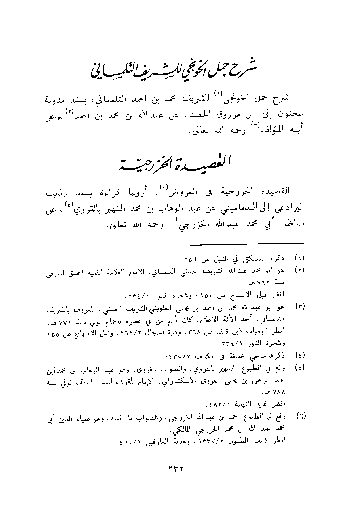 شرح جمل الخونجي للشريف مُحَمَّد بن احْمَد التلمساني بِسَنَد مدونة سَحْنُون الى ابْن مَرْزُوق الْحَفِيد عَن عبد الله بن مُحَمَّد بن احْمَد عَن أَبِيه الْمُؤلف رَحْمَة الله تَعَالَى