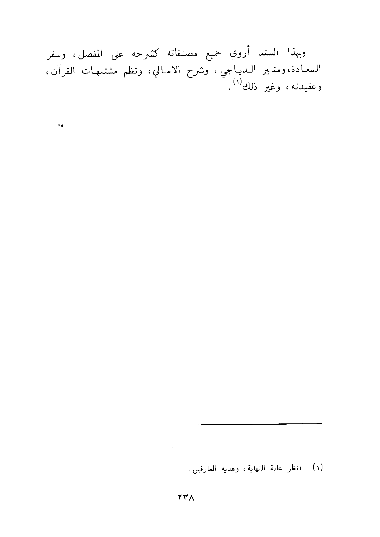 وَبِهَذَا السَّنَد أروي جَمِيع مصنفاته كشرحه على الْمفصل وسفر السَّعَادَة ومنير الدياجي وَشرح الامالي ونظم مُشْتَبهَات الْقُرْآن وعقيدته وَغير ذَلِك