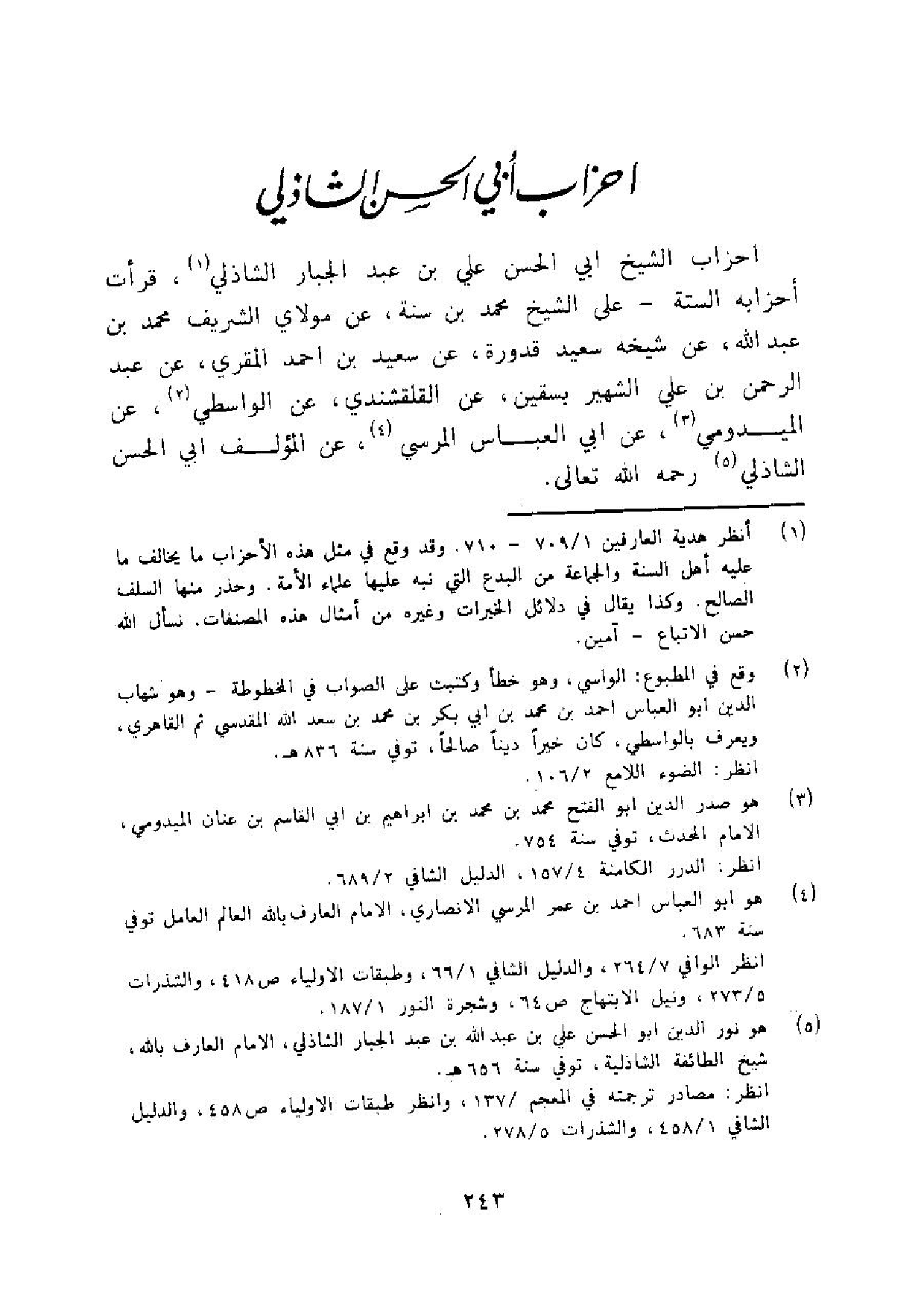 احزاب الشَّيْخ ابي الْحسن عَليّ بن عبد الْجَبَّار الشاذلي قَرَأت أحزابه السِّتَّة على الشَّيْخ مُحَمَّد بن سنة عَن مولَايَ الشريف مُحَمَّد بن عبد الله عَن شَيْخه سعيد قدورة عَن سعيد بن احْمَد الْمقري عَن عبد الرَّحْمَن بن عَليّ الشهير بسقين عَن القلقشندي عَن الوَاسِطِيّ عَن الْمَيْدُومِيُّ عَن ابي الْعَبَّاس المرسي عَن الْمُؤلف ابي الْحسن الشاذلي رَحمَه الله تَعَالَى