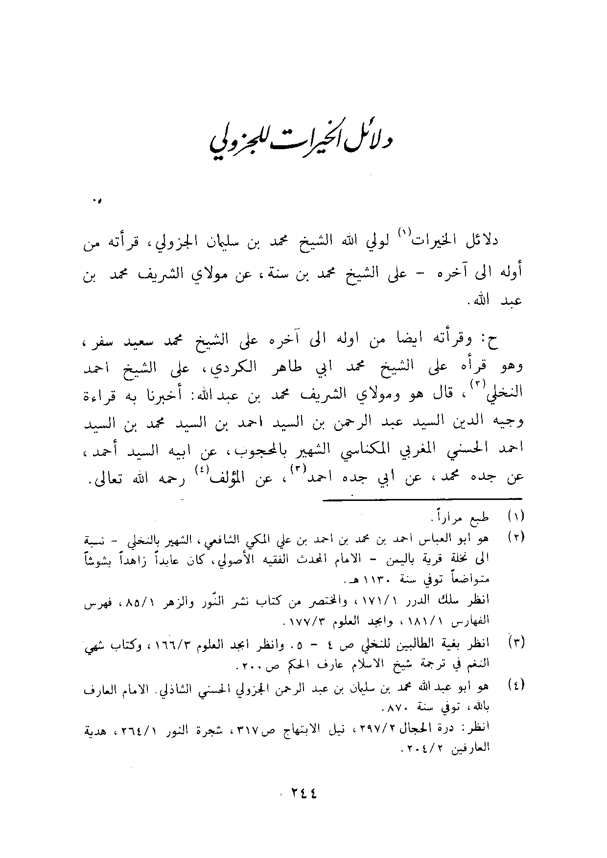 دَلَائِل الْخيرَات لوَلِيّ الله الشَّيْخ مُحَمَّد بن سُلَيْمَان الْجُزُولِيّ قرأته من أَوله الى آخِره على الشَّيْخ مُحَمَّد بن سنة عَن مولَايَ الشريف مُحَمَّد بن عبد الله