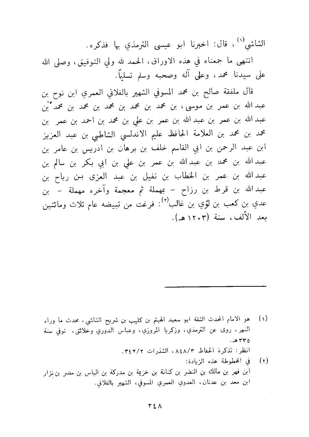 الشَّاشِي قَالَ أخبرنَا أَبُو عِيسَى التِّرْمِذِيّ بهَا فَذكره انْتهى مَا جمعناه فِي هَذِه الاوراق الْحَمد لله ولي التَّوْفِيق وَصلى الله على سيدنَا مُحَمَّد وعَلى آله وَصَحبه وَسلم تَسْلِيمًا