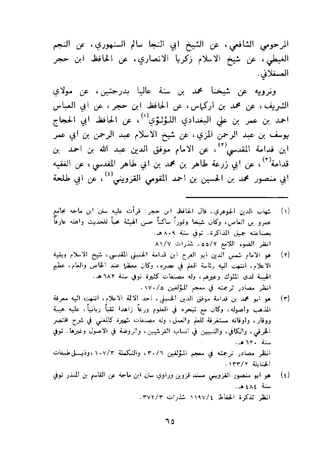 ونرويه عَن شَيخنَا مُحَمَّد بن سنة عَالِيا بدرجتين عَن مولَايَ الشريف عَن مُحَمَّد بن اركماس عَن الْحَافِظ ابْن حجر عَن أبي الْعَبَّاس أَحْمد بن عمر بن عَليّ الْبَغْدَادِيّ اللؤْلُؤِي عَن الْحَافِظ ابي الْحجَّاج يُوسُف بن عبد الرَّحْمَن الْمزي عَن شيخ الاسلام عبد الرَّحْمَن بن ابي عمر ابْن قدامَة الْمَقْدِسِي عَن الامام موفق الدّين عبد الله بن احْمَد بن قدامَة عَن ابي زرْعَة طَاهِر بن مُحَمَّد بن ابي طَاهِر الْمَقْدِسِي عَن الْفَقِيه ابي مَنْصُور مُحَمَّد بن الْحُسَيْن بن احْمَد المقومي الْقزْوِينِي عَن ابي طَلْحَة
