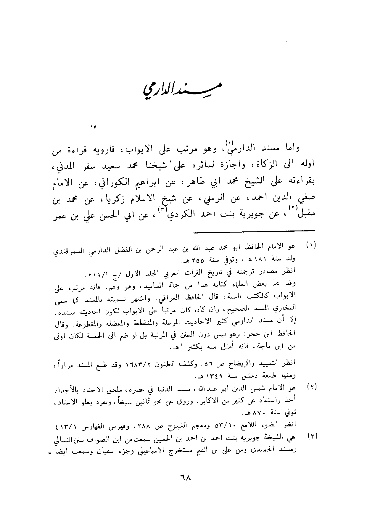 واما مُسْند الدَّارمِيّ وَهُوَ مُرَتّب على الابواب فارويه قِرَاءَة من اوله الى الزَّكَاة واجازة لسائره على شَيخنَا مُحَمَّد سعيد سفر الْمدنِي بقرَاءَته على الشَّيْخ مُحَمَّد ابي طَاهِر عَن ابراهيم الكوراني عَن الامام صفي الدّين احْمَد عَن الرَّمْلِيّ عَن شيخ الاسلام زَكَرِيَّا عَن مُحَمَّد بن مقبل عَن جوَيْرِية بنت احْمَد الْكرْدِي عَن ابي الْحسن عَليّ بن عمر