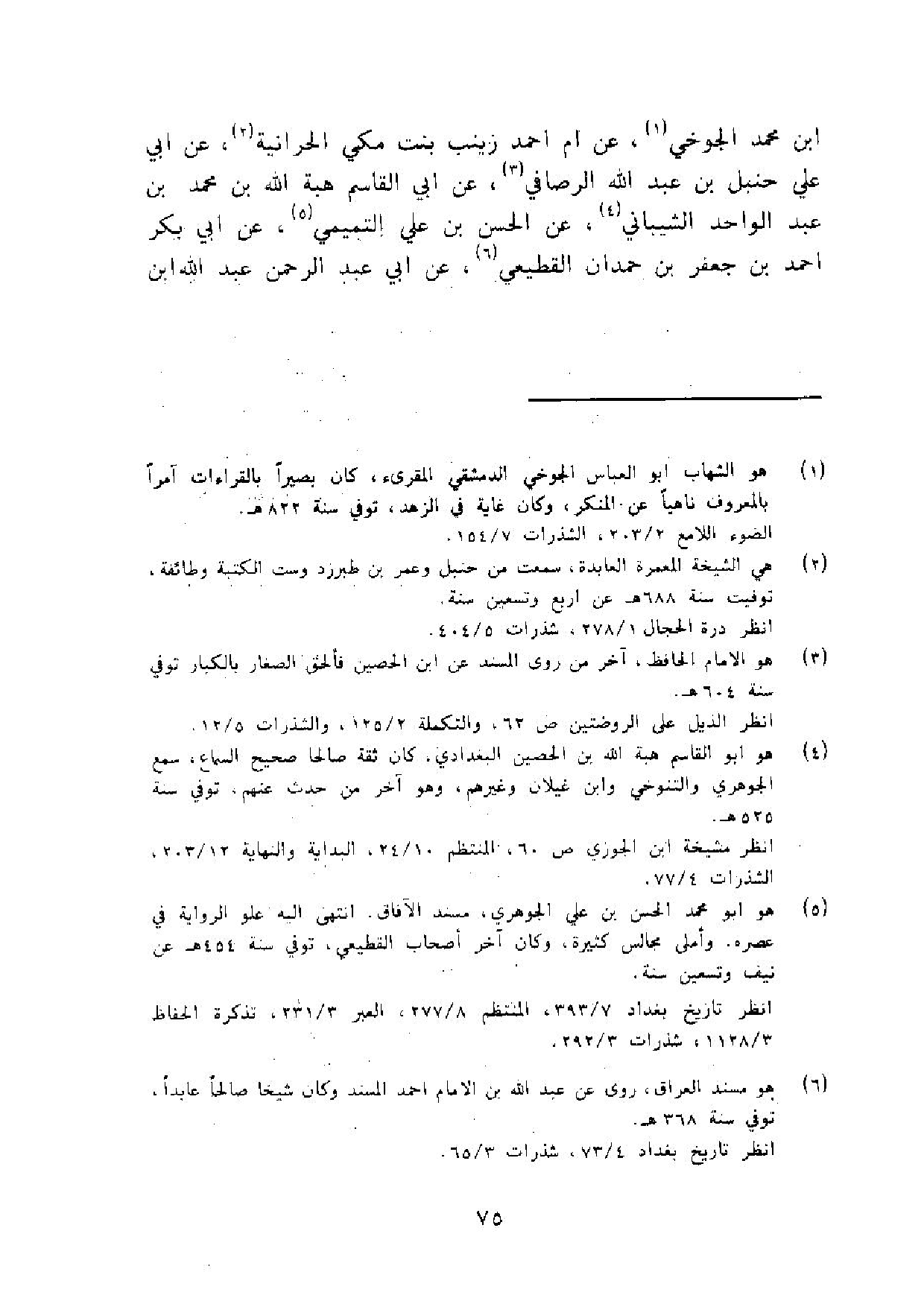 ابْن مُحَمَّد الجوخي عَن ام احْمَد زَيْنَب بنت مكي الحرانية عَن ابي عَليّ حَنْبَل بن عبد الله الرصافي عَن ابي الْقَاسِم هبة الله بن مُحَمَّد بن عبد الْوَاحِد الشَّيْبَانِيّ عَن الْحسن بن عَليّ التَّمِيمِي عَن ابي بكر احْمَد بن جَعْفَر بن حمدَان الْقطيعِي عَن ابي عبد الرَّحْمَن عبد الله ابْن