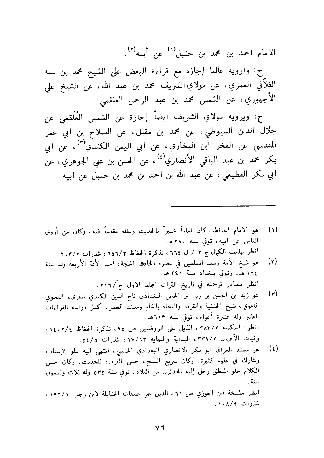 ح وَيَرْوِيه مولَايَ الشريف ايضا إجَازَة عَن الشَّمْس العلقمي عَن جلال الدّين السُّيُوطِيّ عَن مُحَمَّد بن مقبل عَن الصّلاح بن ابي عمر الْمَقْدِسِي عَن الْفَخر ابْن البُخَارِيّ عَن ابي الْيمن الْكِنْدِيّ عَن ابي بكر مُحَمَّد بن عبد الْبَاقِي الْأنْصَارِيّ عَن الْحسن بن عَليّ الْجَوْهَرِي عَن ابي بكر الْقطيعِي عَن عبد الله بن احْمَد بن مُحَمَّد بن حَنْبَل عَن ابيه