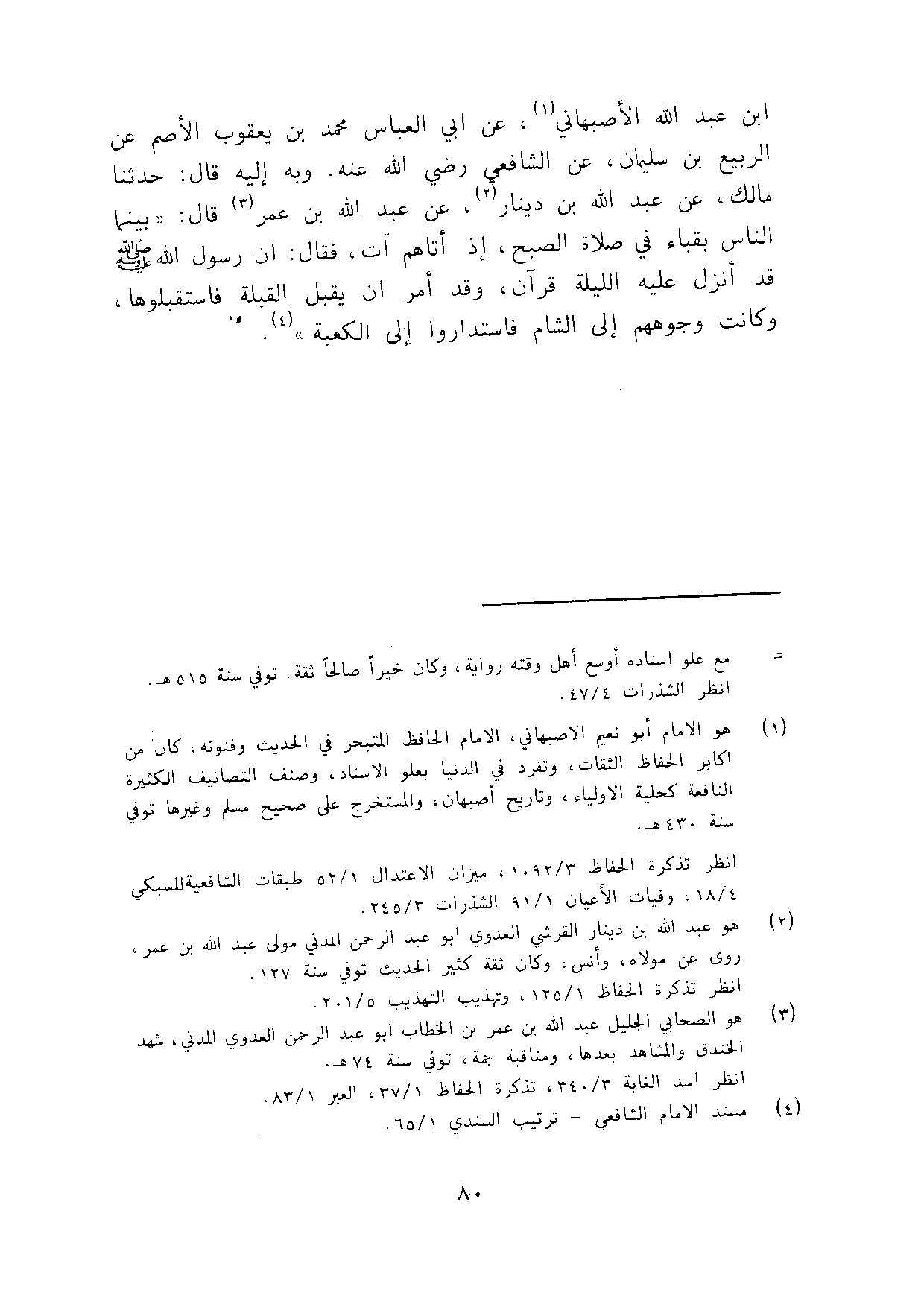 ابْن عبد الله الْأَصْبَهَانِيّ عَن ابي الْعَبَّاس مُحَمَّد بن يَعْقُوب الْأَصَم عَن الرّبيع بن سُلَيْمَان عَن الشَّافِعِي رَضِي الله عَنهُ وَبِه اليه قَالَ حَدثنَا مَالك عَن عبد الله بن دِينَار عَن عبد الله بن عمر قَالَ بَيْنَمَا النَّاس بقباء فِي صَلَاة الصُّبْح إِذْ أَتَاهُم آتٍ فَقَالَ أَن رَسُول الله صلى الله عَلَيْهِ وَسلم قد أنزل عَلَيْهِ اللَّيْلَة قُرْآن وَقد أَمر أَن يقبل الْقبْلَة فاستقبلوها وَكَانَت وُجُوههم الى الشَّام فاستداروا الى الْكَعْبَة