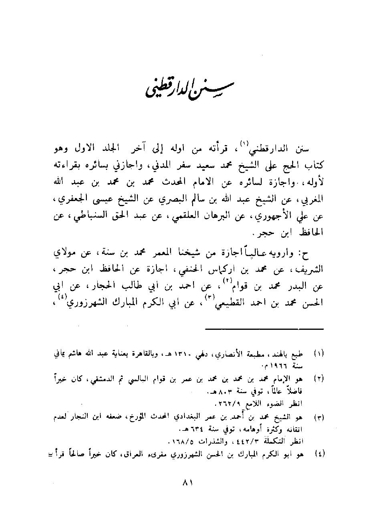 سنَن الدَّارَقُطْنِيّ قرأته من اوله الى آخر الْجلد الاول وَهُوَ كتاب الْحَج على الشَّيْخ مُحَمَّد سعيد سفر الْمدنِي واجازني بسائره بقرَاءَته لأوله واجازة لسائره عَن الامام الْمُحدث مُحَمَّد بن مُحَمَّد بن عبد الله المغربي عَن الشَّيْخ عبد الله بن سَالم الْبَصْرِيّ عَن الشَّيْخ عِيسَى الْجَعْفَرِي عَن عَليّ الأَجْهُورِيّ عَن الْبُرْهَان العلقمي عَن عبد الْحق السنباطي عَن الْحَافِظ ابْن حجر
