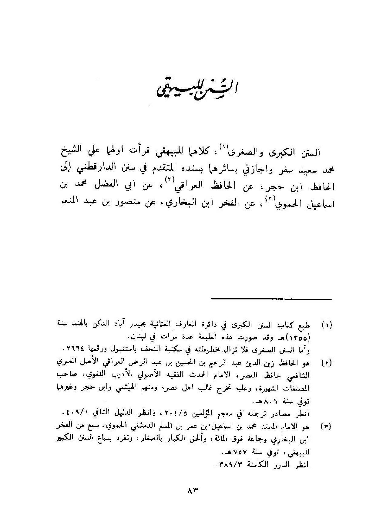 السّنَن الْكُبْرَى وَالصُّغْرَى كِلَاهُمَا للبيهقي قَرَأت اولهما على الشَّيْخ مُحَمَّد سعيد سفر واجازني بسائرهما بِسَنَدِهِ الْمُتَقَدّم فِي سنَن الدَّارَقُطْنِيّ الى الْحَافِظ ابْن حجر عَن الْحَافِظ الْعِرَاقِيّ عَن ابي الْفضل مُحَمَّد بن اسماعيل الْحَمَوِيّ عَن الْفَخر ابْن البُخَارِيّ عَن مَنْصُور بن عبد الْمُنعم