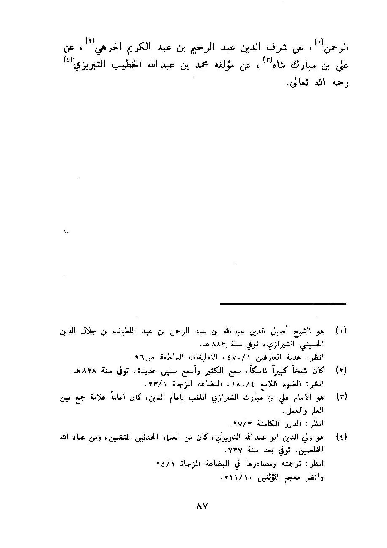 الرَّحْمَن عَن شرف الدّين عبد الرَّحِيم بن عبد الْكَرِيم الجرهي عَن عَليّ بن مبارك شاه عَن مُؤَلفه مُحَمَّد بن عبد الله الْخَطِيب التبريزي رَحمَه الله تَعَالَى
