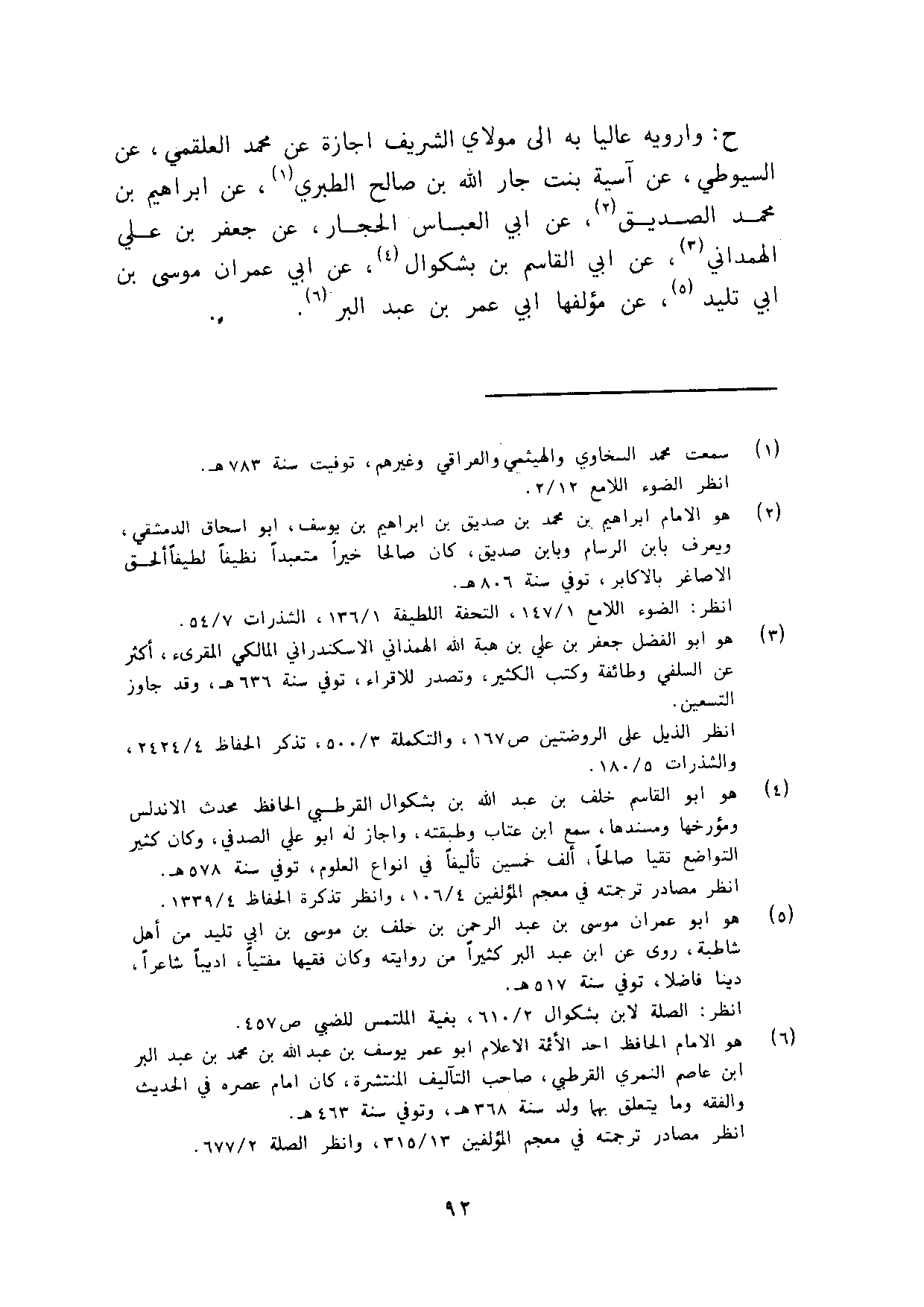 ح وارويه عَالِيا بِهِ الى مولَايَ الشريف اجازة عَن مُحَمَّد العلقمي عَن السُّيُوطِيّ عَن آسِيَة بنت جَار الله بن صَالح الطَّبَرِيّ عَن ابراهيم بن مُحَمَّد الصّديق عَن ابي الْعَبَّاس الحجار عَن جَعْفَر بن عَليّ الْهَمدَانِي عَن ابي الْقَاسِم بن بشكوال عَن ابي عمرَان مُوسَى بن ابي تليد عَن مؤلفها ابي عمر بن عبد الْبر