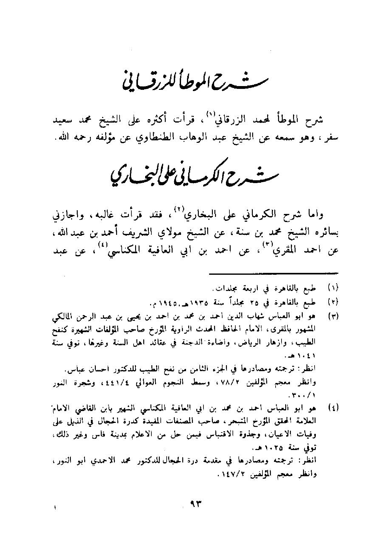 واما شرح الْكرْمَانِي على البُخَارِيّ فقد قَرَأت غالبه واجازني بسائره الشَّيْخ مُحَمَّد بن سنة عَن الشَّيْخ مولَايَ الشريف أَحْمد بن عبد الله عَن احْمَد الْمقري عَن احْمَد بن ابي الْعَافِيَة المكناسي عَن