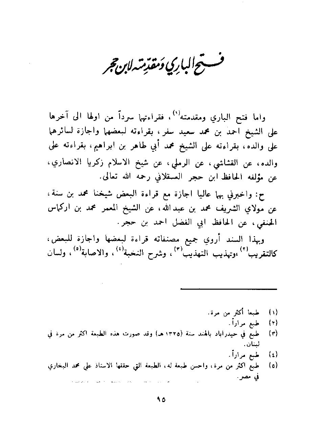 واما فتح الْبَارِي ومقدمته فقراءتهما سردا من اولها الى آخرهَا على الشَّيْخ احْمَد بن مُحَمَّد سعيد سفر بقرَاءَته لبعضهما واجازة لسائرهما على وَالِده بقرَاءَته على الشَّيْخ مُحَمَّد أبي طَاهِر بن ابراهيم بقرَاءَته على وَالِده عَن القشاشي عَن الرَّمْلِيّ عَن شيخ الاسلام زَكَرِيَّا الانصاري عَن مُؤَلفه الْحَافِظ ابْن حجر الْعَسْقَلَانِي رَحمَه الله تَعَالَى