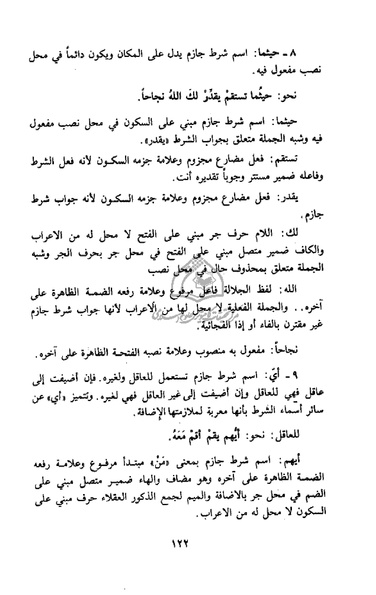 9 - أيّ: اسم شرط جازم تستعمل للعاقل ولغيره. فإن أضيفت إلى عاقل فهي للعاقل وإن أضيفت إلى غير العاقل فهي لغيره. وتتميز «أي» عن سائر أسماء الشرط بأنها معربة لملازمتها الإضافة.