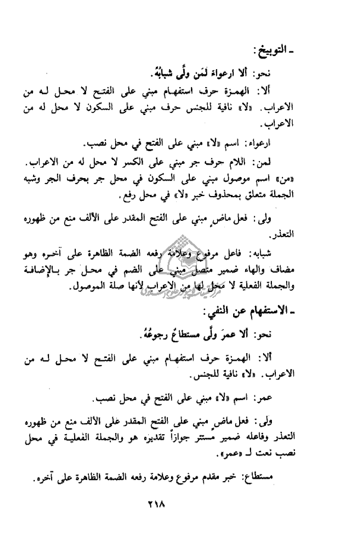 نحو: ألا ارعواء لمن ولّى شبابه.