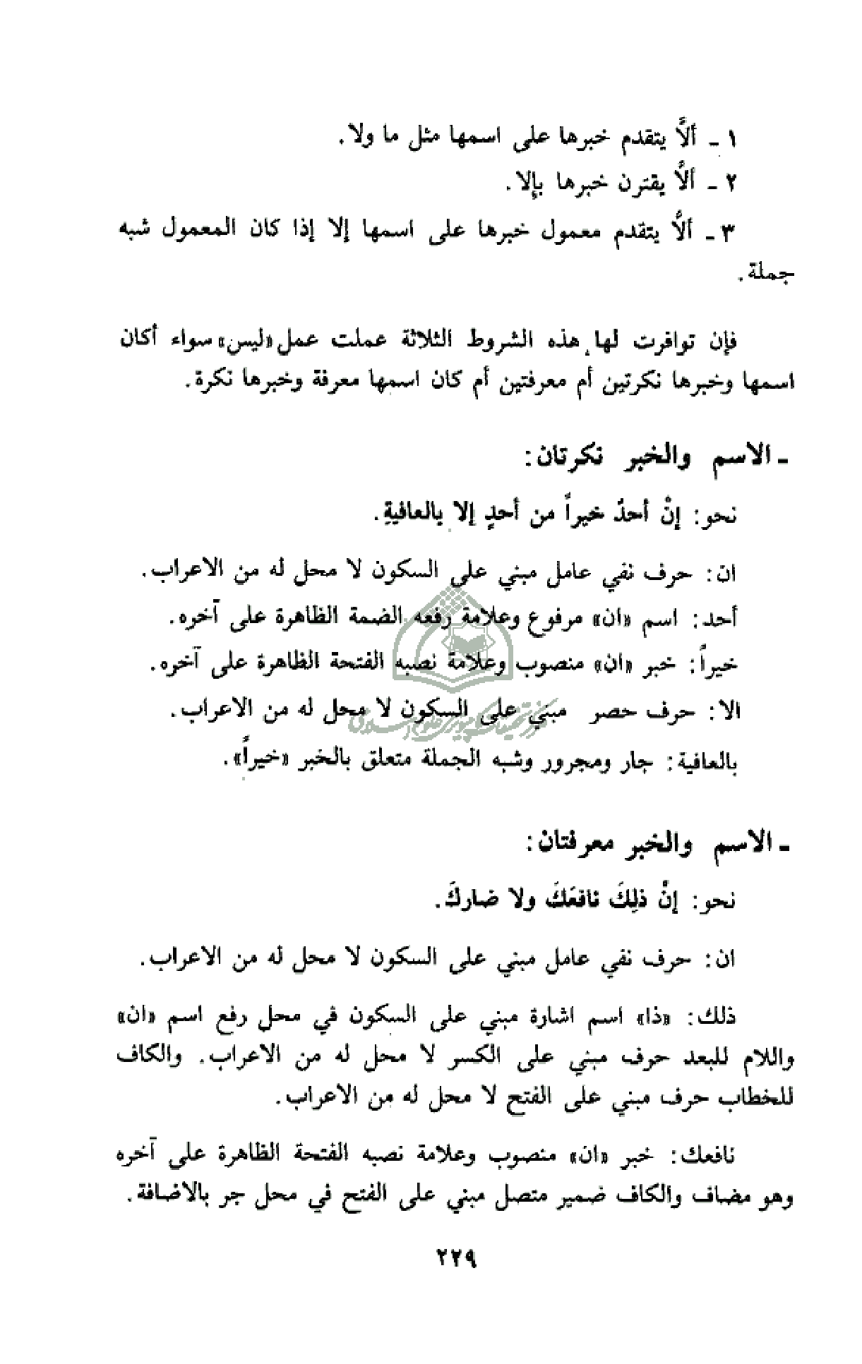 فإن توافرت لها هذه الشروط الثلاثة عملت عمل «ليس» سواء أكان اسمها وخبرها نكرتين أم معرفتين أم كان اسمها معرفة وخبرها نكرة.