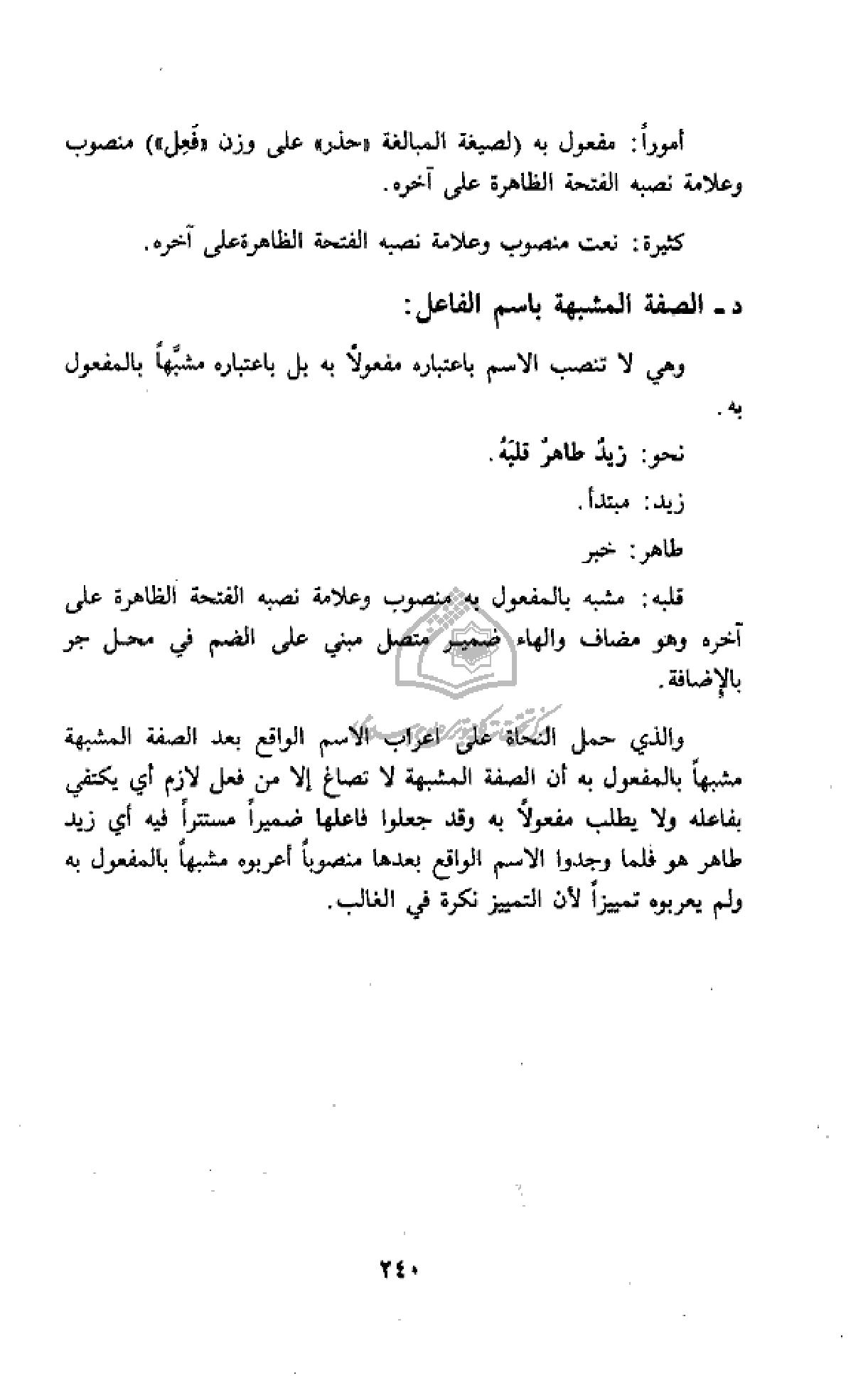والذي حمل النحاة على اعراب الاسم الواقع بعد الصفة المشبهة مشبها بالمفعول به أن الصفة المشبهة لا تصاغ إلا من فعل لازم أي يكتفي بفاعله ولا يطلب مفعولا به وقد جعلوا فاعلها ضميرا مستترا فيه أي زيد طاهر هو فلما وجدوا الاسم الواقع بعدها منصوبا أعربوه مشبها بالمفعول به ولم يعربوه تمييزا لأن التمييز نكرة في الغالب.