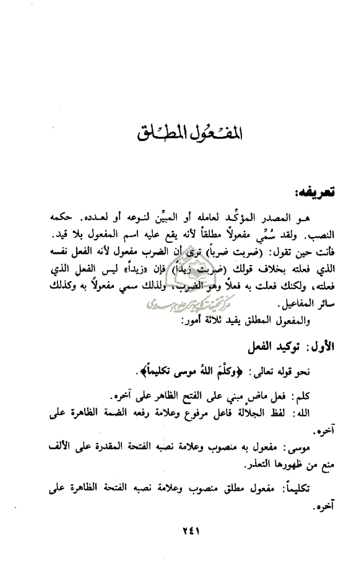 هو المصدر المؤكّد لعامله أو المبيّن لنوعه أو لعدده. حكمه النصب. ولقد سمّي مفعولا مطلقا لأنه يقع عليه اسم المفعول بلا قيد.
