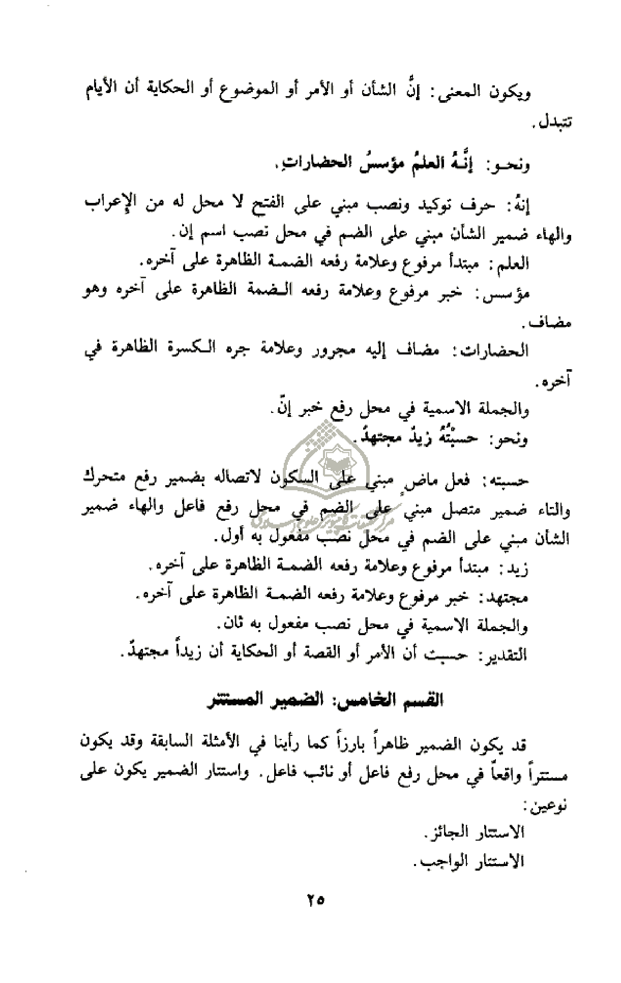 قد يكون الضمير ظاهرا بارزا كما رأينا في الأمثلة السابقة وقد يكون مستترا واقعا في محل رفع فاعل أو نائب فاعل. واستتار الضمير يكون على نوعين: