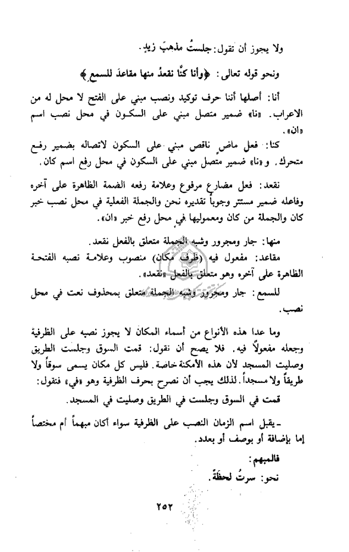 وما عدا هذه الأنواع من أسماء المكان لا يجوز نصبه على الظرفية وجعله مفعولا فيه. فلا يصح أن نقول: قمت السوق وجلست الطريق وصليت المسجد لأن هذه الأمكنة خاصة. فليس كل مكان يسمى سوقا ولا طريقا ولا مسجدا. لذلك يجب أن نصرح بحرف الظرفية وهو «في» فنقول: