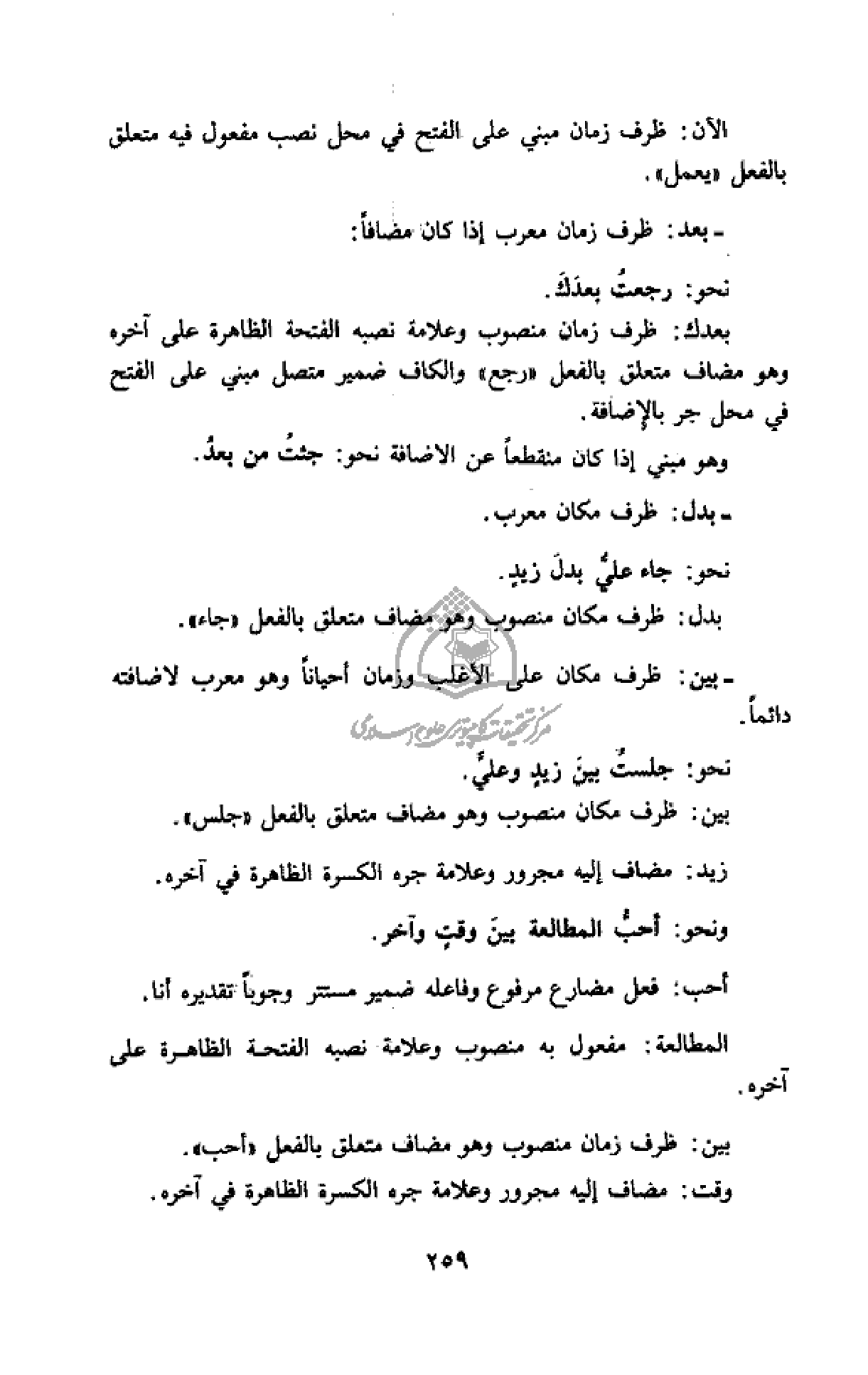 - بين: ظرف مكان على الأغلب وزمان أحيانا وهو معرب لاضافته دائما.
