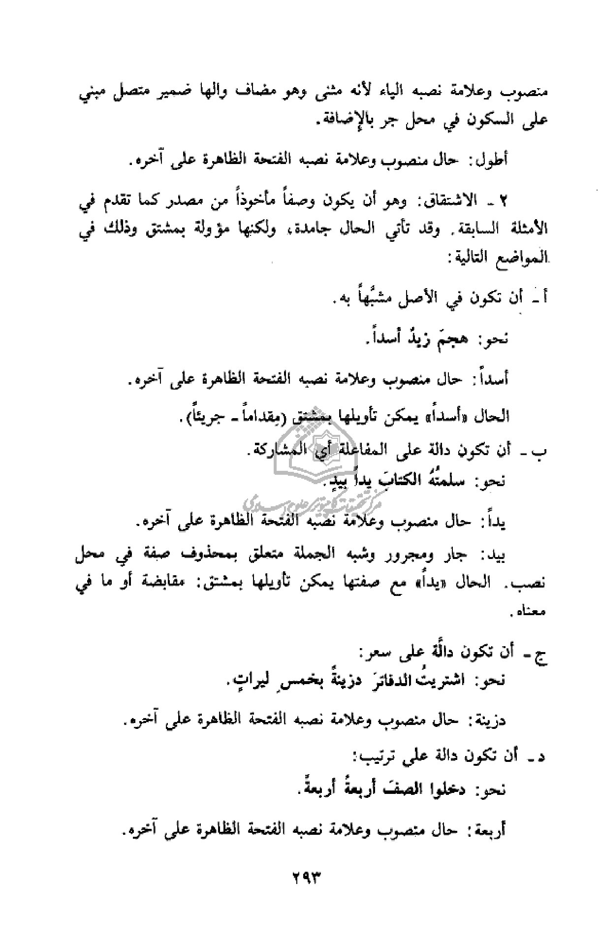2 - الاشتقاق: وهو أن يكون وصفا مأخوذا من مصدر كما تقدم في الأمثلة السابقة. وقد تأتي الحال جامدة، ولكنها مؤولة بمشتق وذلك في المواضع التالية: