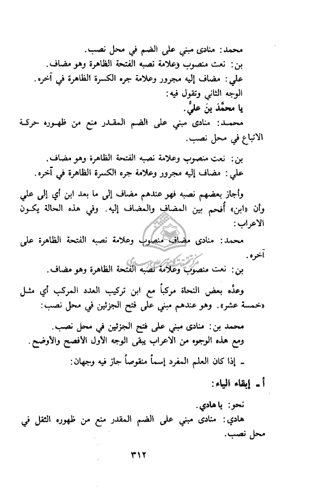 وأجاز بعضهم نصبه فهو عندهم مضاف إلى ما بعد ابن أي إلى علي وأن «ابن» أفحم بين المضاف والمضاف إليه. وفي هذه الحالة يكون الاعراب: