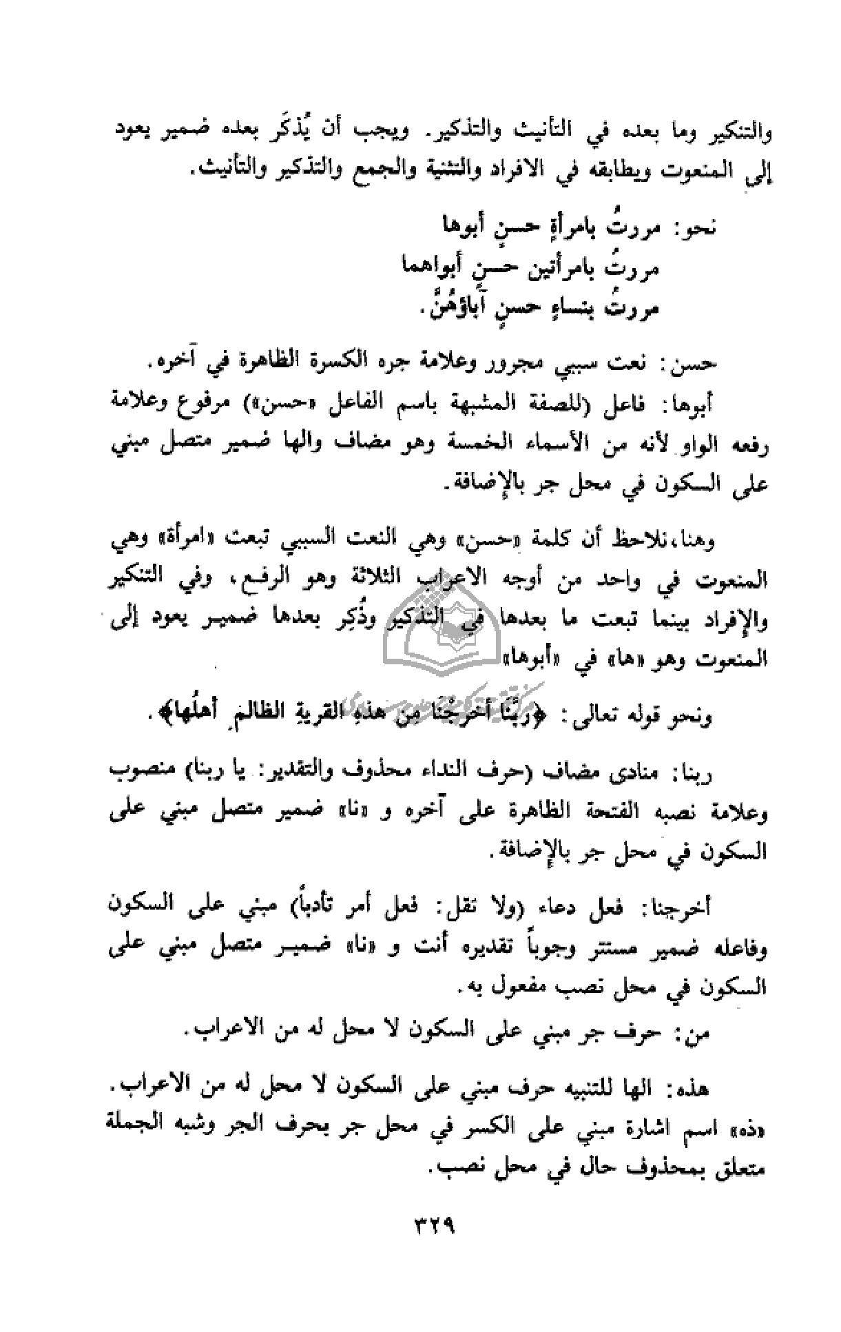 وهنا، نلاحظ أن كلمة «حسن» وهي النعت السببي تبعت «امرأة» وهي المنعوت في واحد من أوجه الاعراب الثلاثة وهو الرفع، وفي التنكير والإفراد بينما تبعت ما بعدها في التذكير وذكر بعدها ضمير يعود إلى المنعوت وهو «ها» في «أبوها»