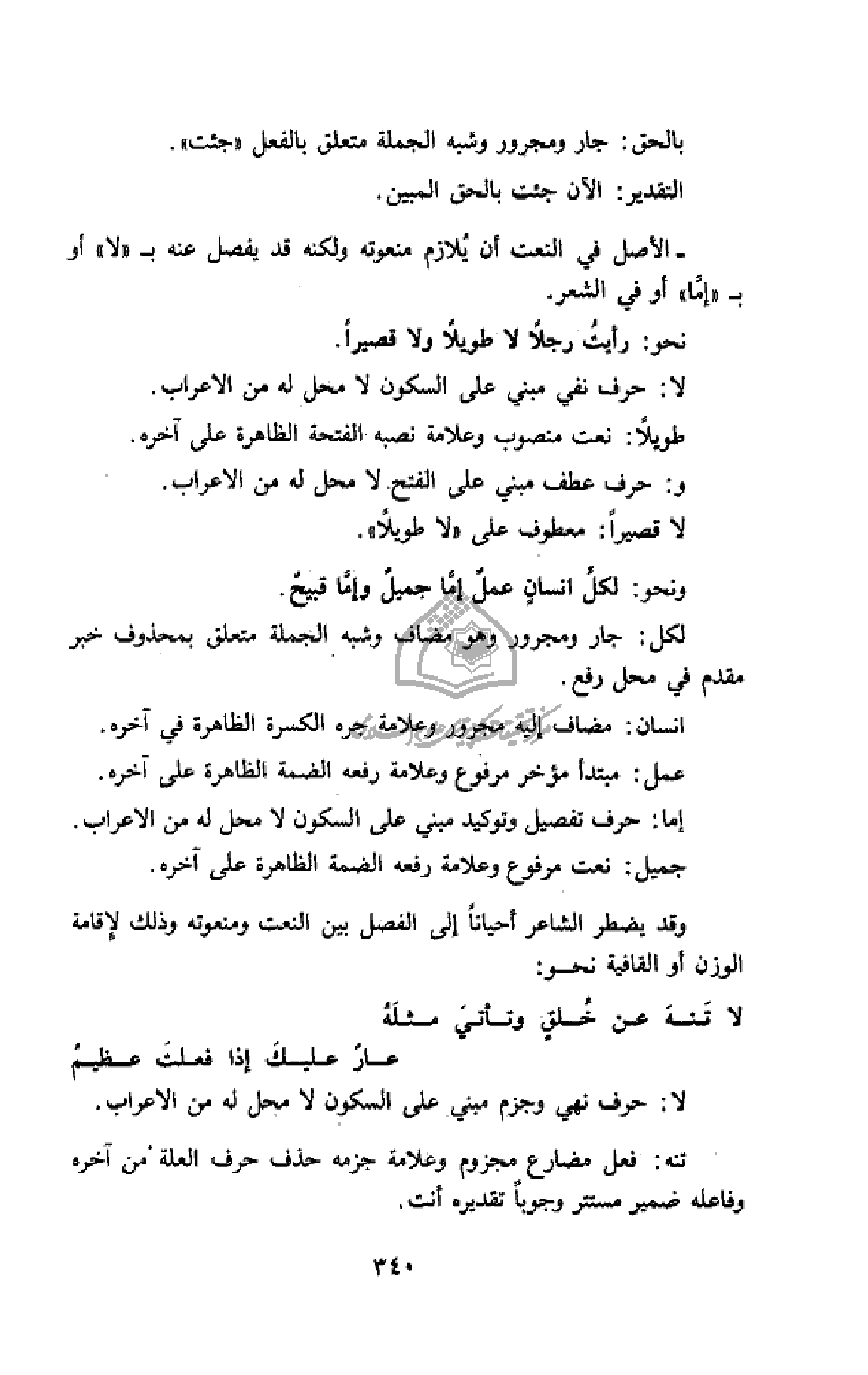 - الأصل في النعت أن يلازم منعوته ولكنه قد يفصل عنه ب «لا» أو ب «إمّا» أو في الشعر.