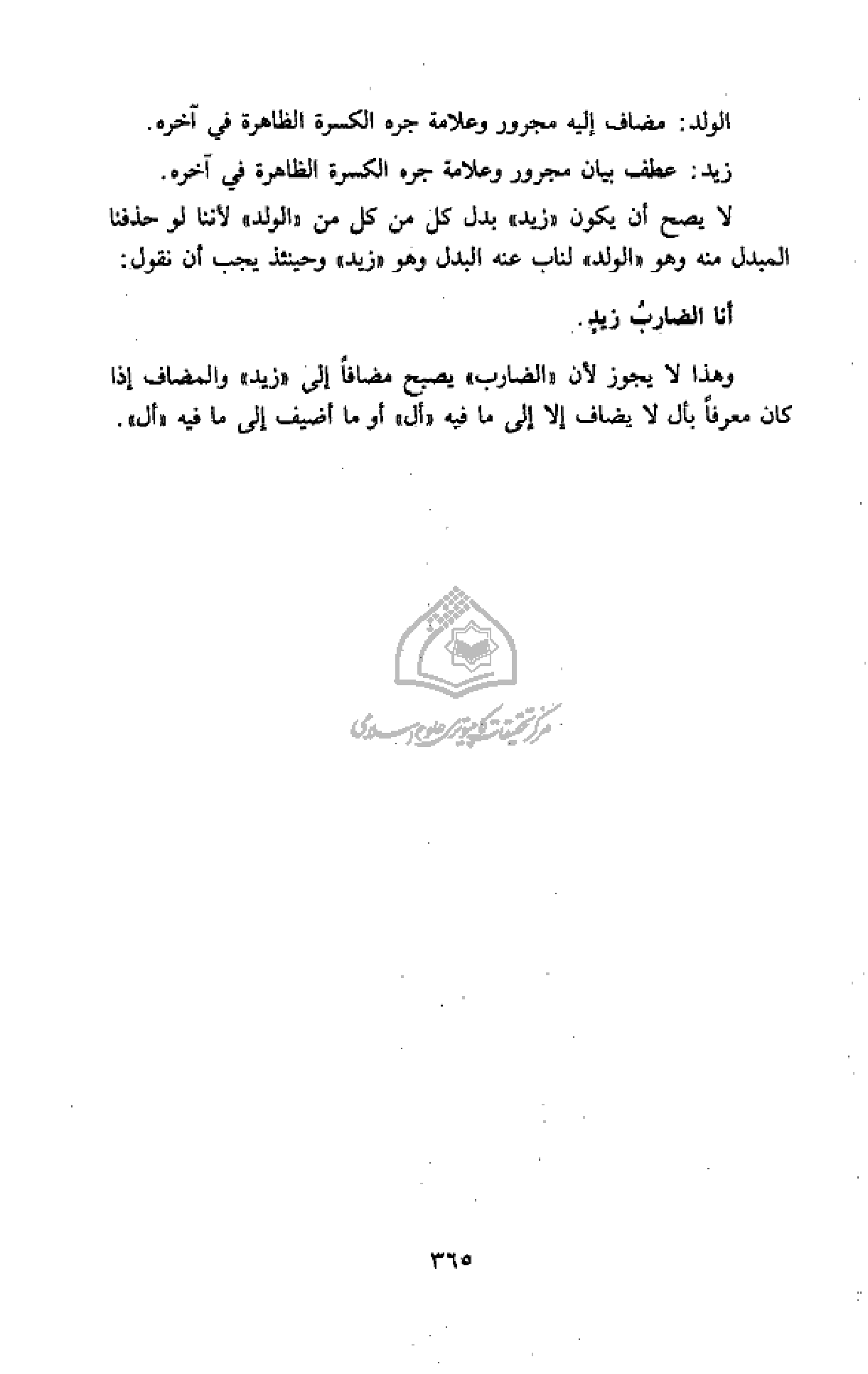 وهذا لا يجوز لأن «الضارب» يصبح مضافا إلى «زيد» والمضاف إذا كان معرفا بأل لا يضاف إلا إلى ما فيه «أل» أو ما أضيف إلى ما فيه «أل».