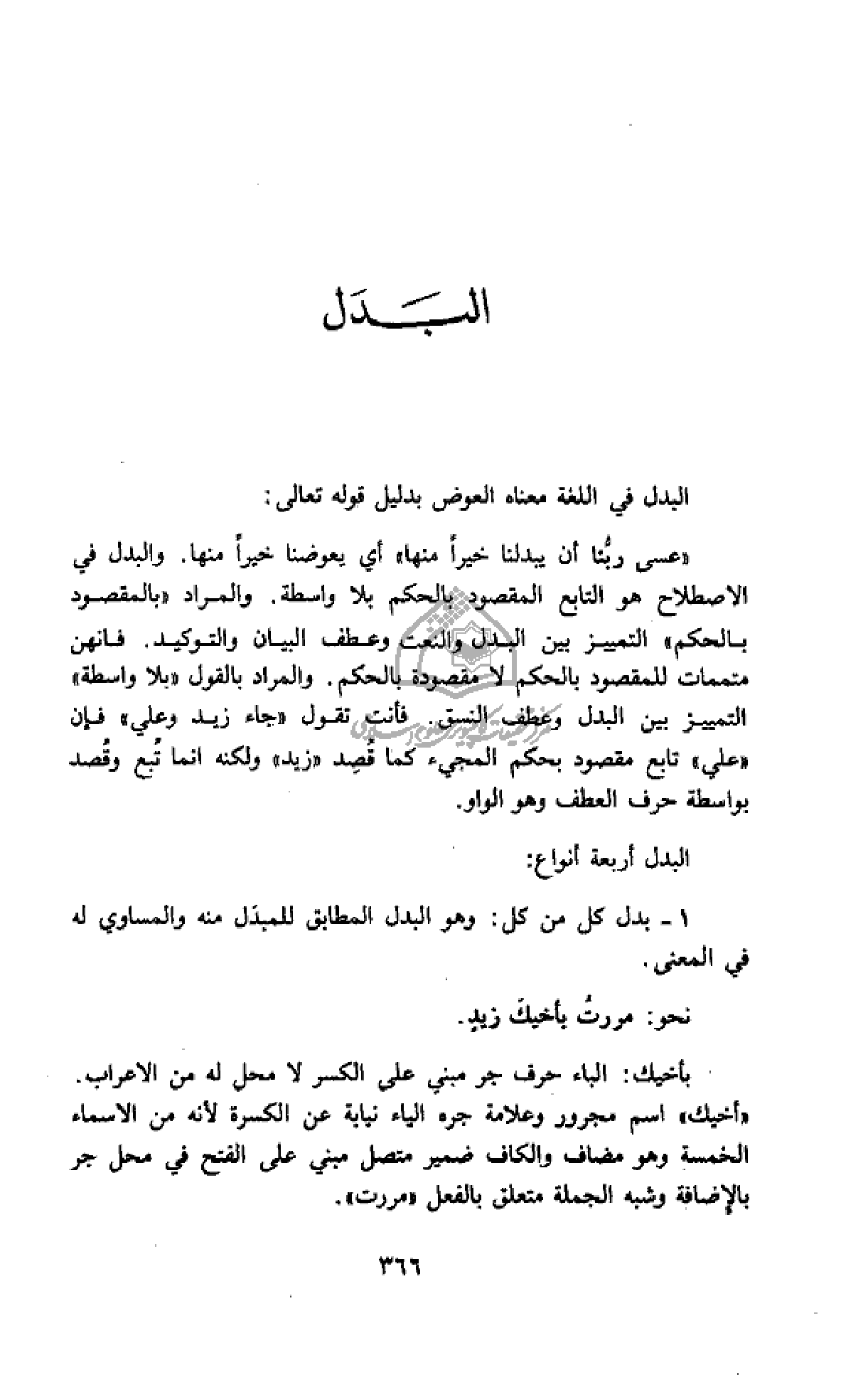 «عَسى رَبُّنا أَنْ يُبْدِلَنا خَيْراً مِنْها» أي يعوضنا خيرا منها. والبدل في الاصطلاح هو التابع المقصود بالحكم بلا واسطة. والمراد «بالمقصود بالحكم» التمييز بين البدل والنعت وعطف البيان والتوكيد. فانهن متممات للمقصود بالحكم لا مقصودة بالحكم. والمراد بالقول «بلا واسطة» التمييز بين البدل وعطف النسق. فأنت تقول «جاء زيد وعلي» فإن «علي» تابع مقصود بحكم المجيء كما قصد «زيد» ولكنه انما تبع وقصد بواسطة حرف العطف وهو الواو.