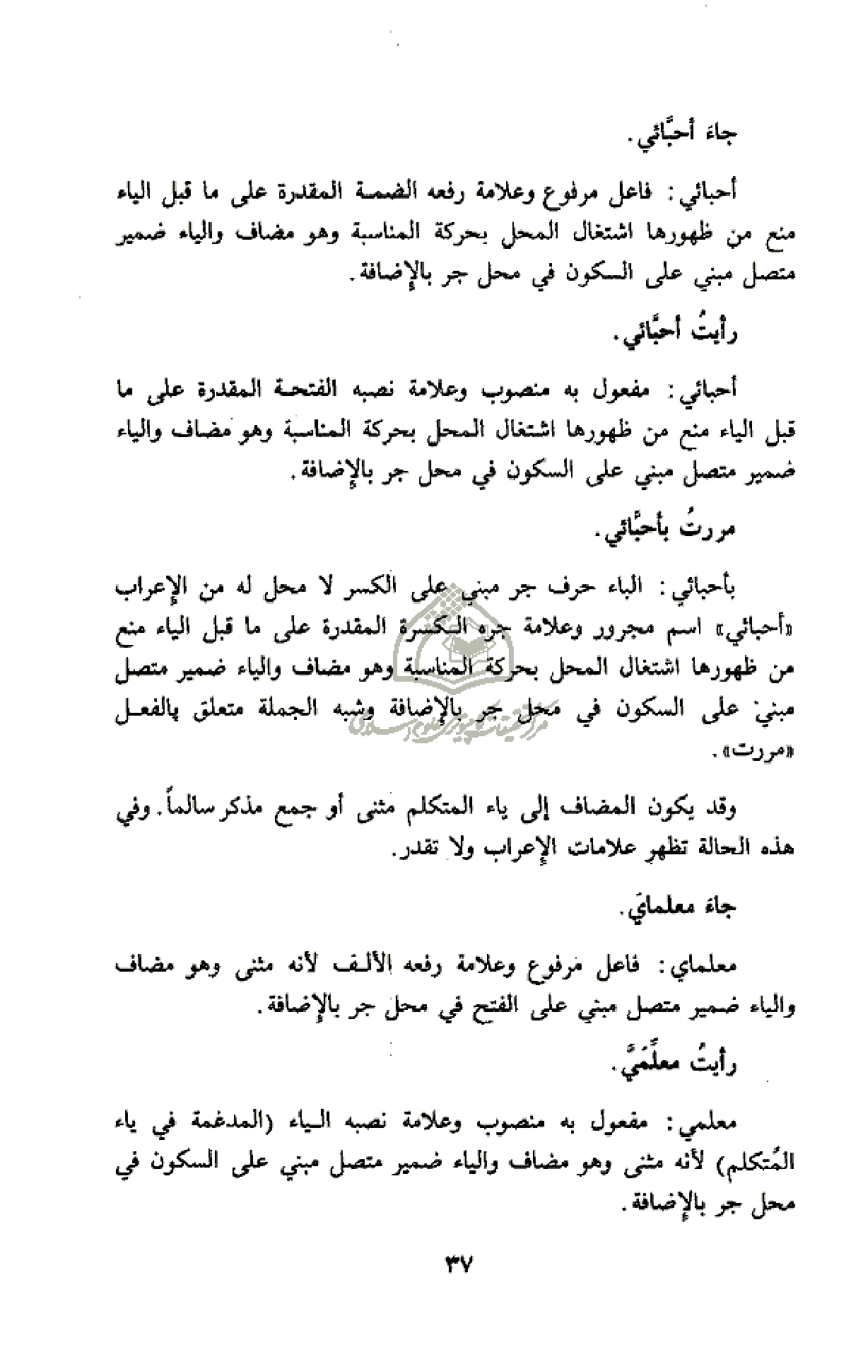 وقد يكون المضاف إلى ياء المتكلم مثنى أو جمع مذكر سالما. وفي هذه الحالة تظهر علامات الإعراب ولا تقدر.