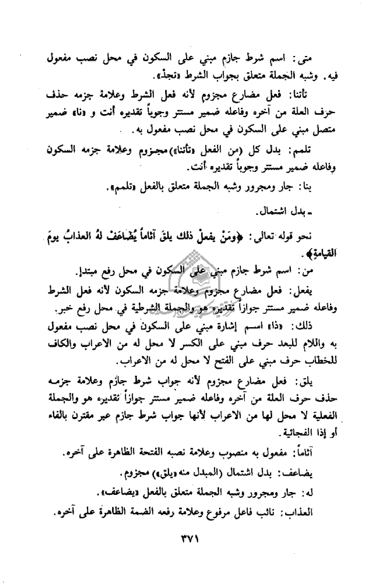 نحو قوله تعالى: وَمَنْ يَفْعَلْ ذلِكَ يَلْقَ أَثاماً يُضاعَفْ لَهُ الْعَذابُ يَوْمَ الْقِيامَةِ.