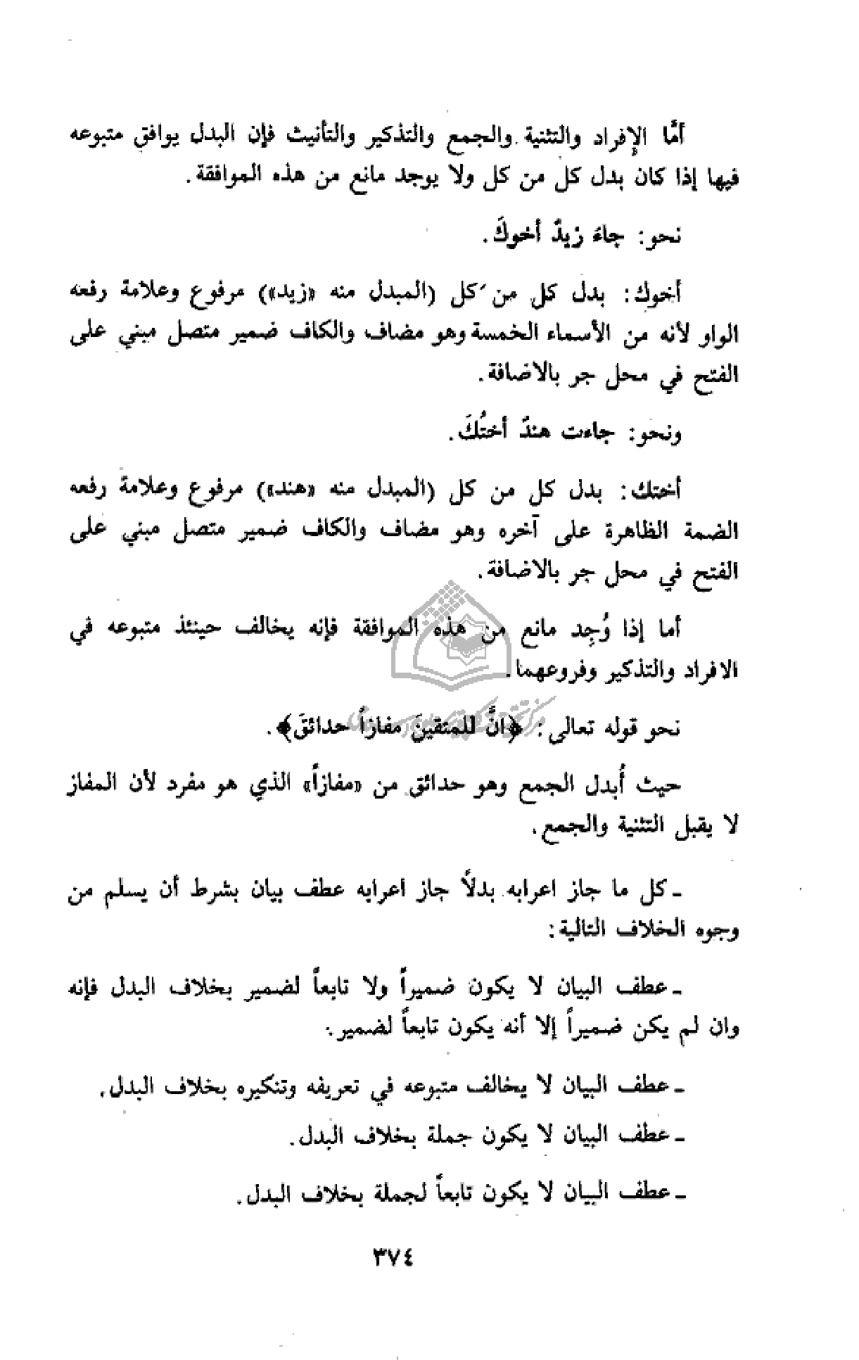 - عطف البيان لا يكون ضميرا ولا تابعا لضمير بخلاف البدل فإنه وان لم يكن ضميرا إلا أنه يكون تابعا لضمير: