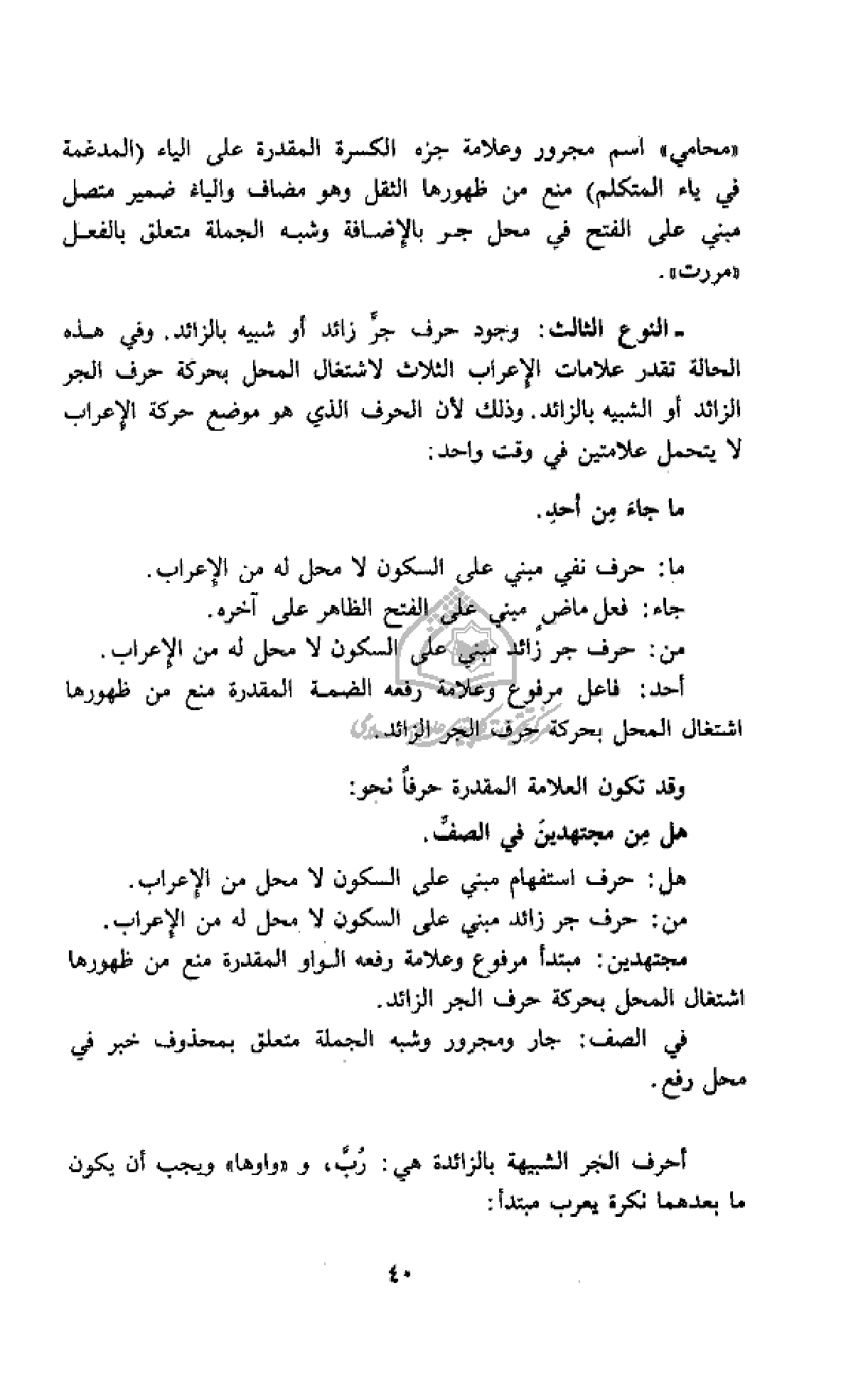 - النوع الثالث: وجود حرف جرّ زائد أو شبيه بالزائد. وفي هذه الحالة تقدر علامات الإعراب الثلاث لاشتغال المحل بحركة حرف الجر الزائد أو الشبيه بالزائد. وذلك لأن الحرف الذي هو موضع حركة الإعراب لا يتحمل علامتين في وقت واحد:
