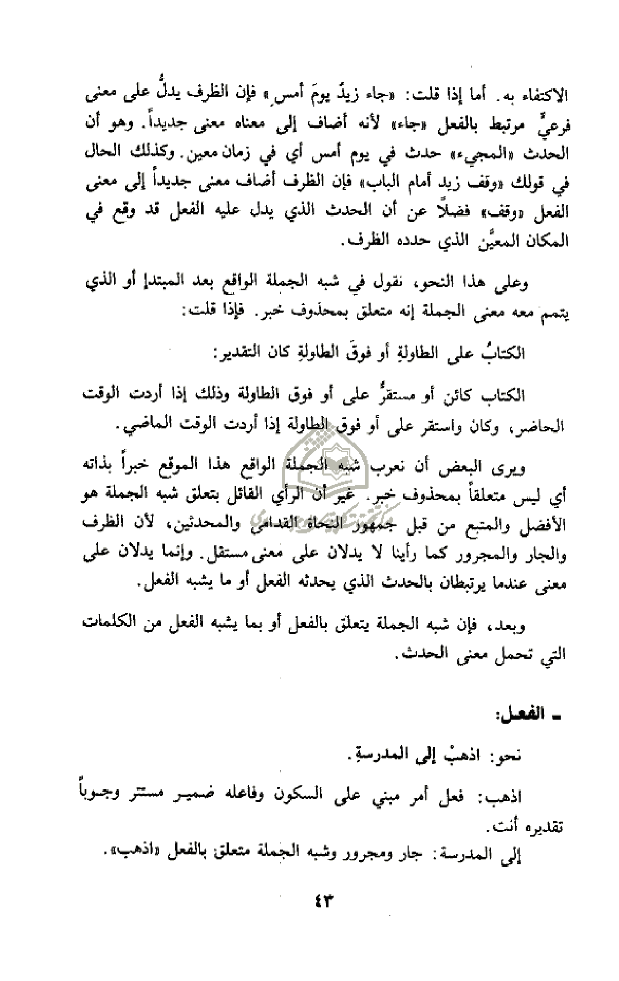 الاكتفاء به. أما إذا قلت: «جاء زيد يوم أمس» فإن الظرف يدلّ على معنى فرعيّ مرتبط بالفعل «جاء» لأنه أضاف إلى معناه معنى جديدا. وهو أن الحدث «المجيء» حدث في يوم أمس أي في زمان معين. وكذلك الحال في قولك «وقف زيد أمام الباب» فإن الظرف أضاف معنى جديدا إلى معنى الفعل «وقف» فضلا عن أن الحدث الذي يدل عليه الفعل قد وقع في المكان المعيّن الذي حدده الظرف.
