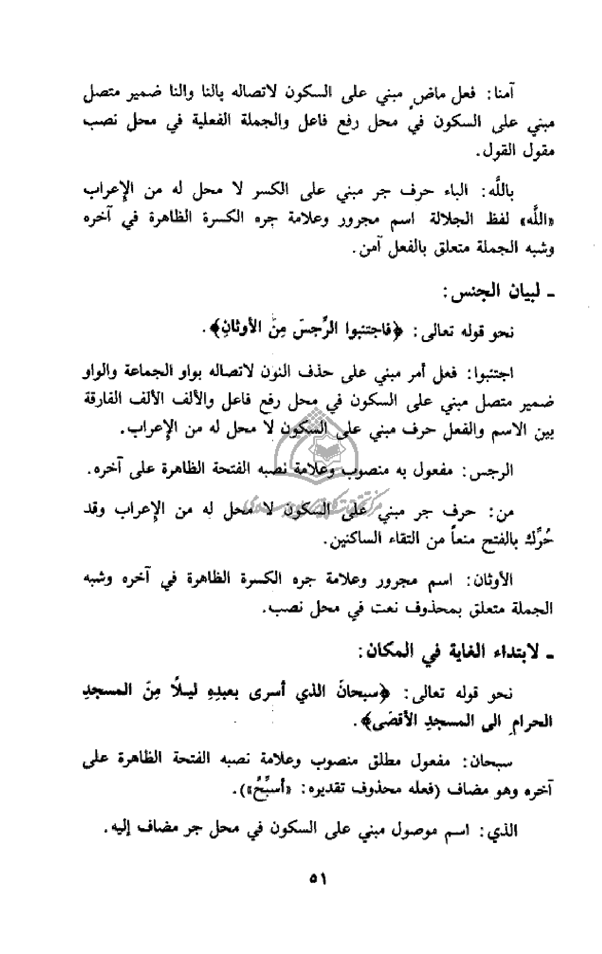 نحو قوله تعالى: سُبْحانَ الَّذِي أَسْرى بِعَبْدِهِ لَيْلًا مِنَ الْمَسْجِدِ الْحَرامِ إِلَى الْمَسْجِدِ الْأَقْصَى.